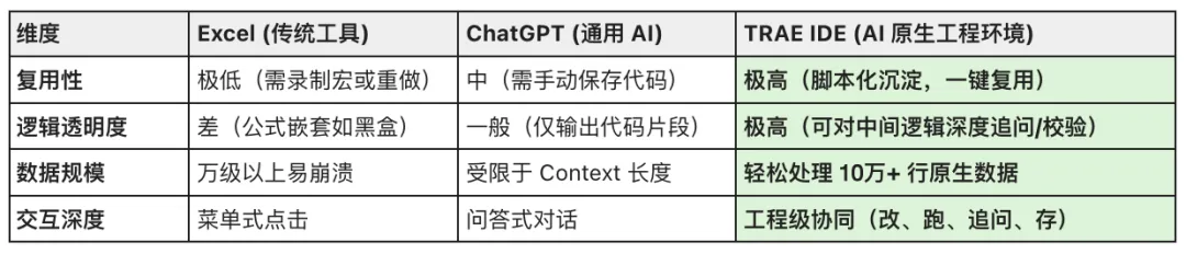 我们把 Excel、ChatGPT、TRAE IDE 基于数据分析的场景进行了多维度对比,可以发现 IDE 在效率、适配性与智能化上全面超越 Excel 与 Chatbot(例如 ChatGPT):
