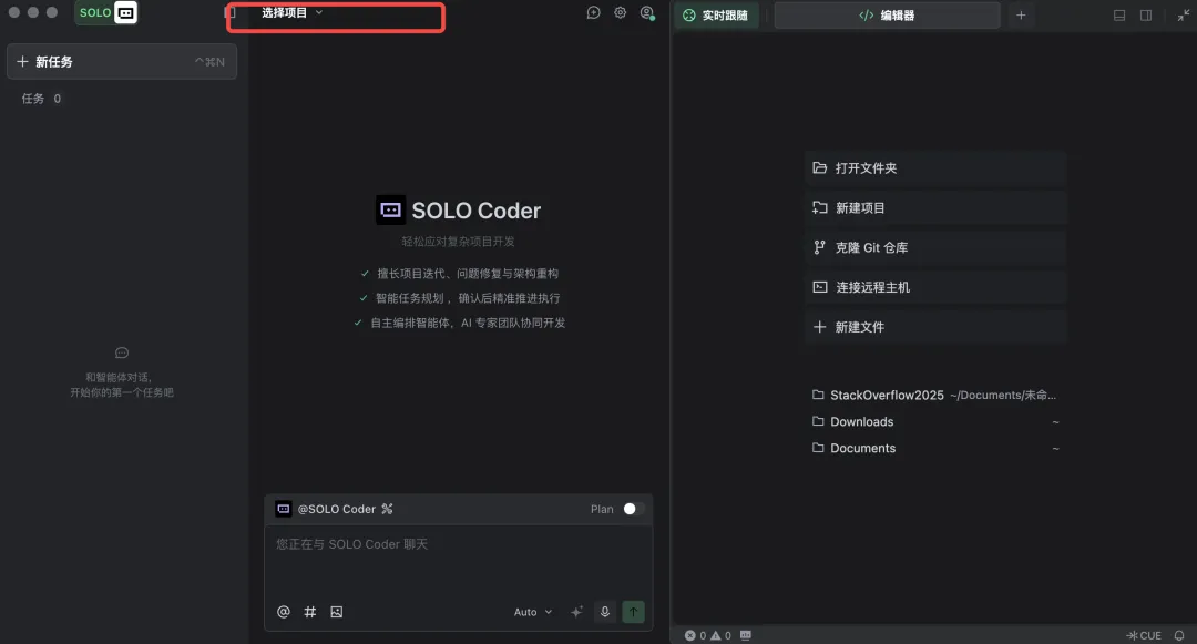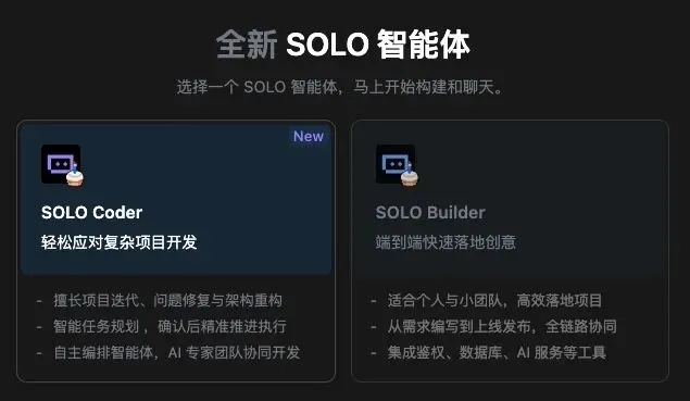 SOLO 有 2 个选项,分别为 SOLO Builder 和 SOLO Coder,我们本次选择 SOLO Coder,其中的 Plan 模式也为分析方案的讨论提供了很大便利。