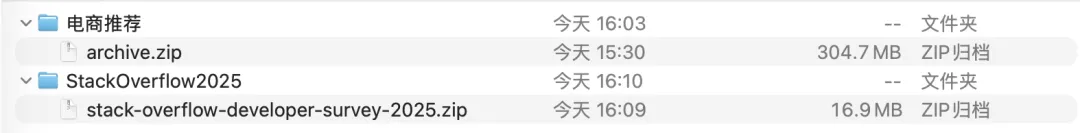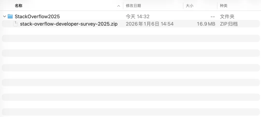 从 https://survey.stackoverflow.co/ 下载 Stack Overflow 2025 调研数据集,包含「受访者基本信息、技术使用习惯、AI 工具态度」等维度,将数据集保存至本地文件夹(例如 “StackOverflow2025” ),方便后续 TRAE 进行读取。