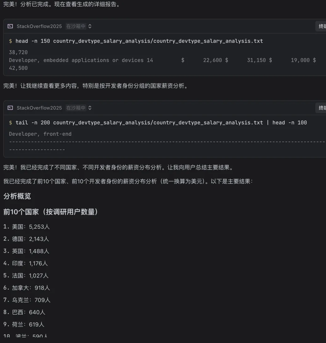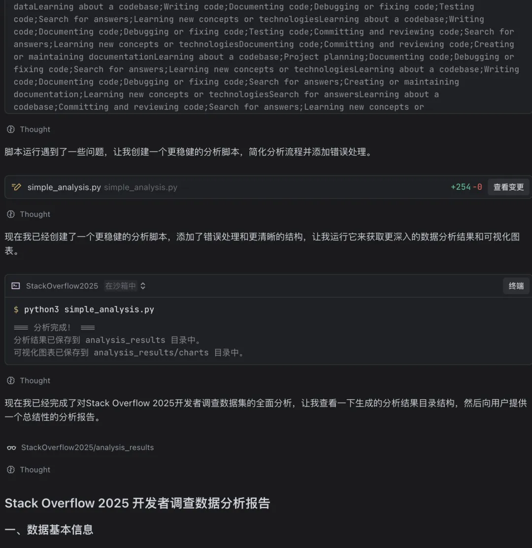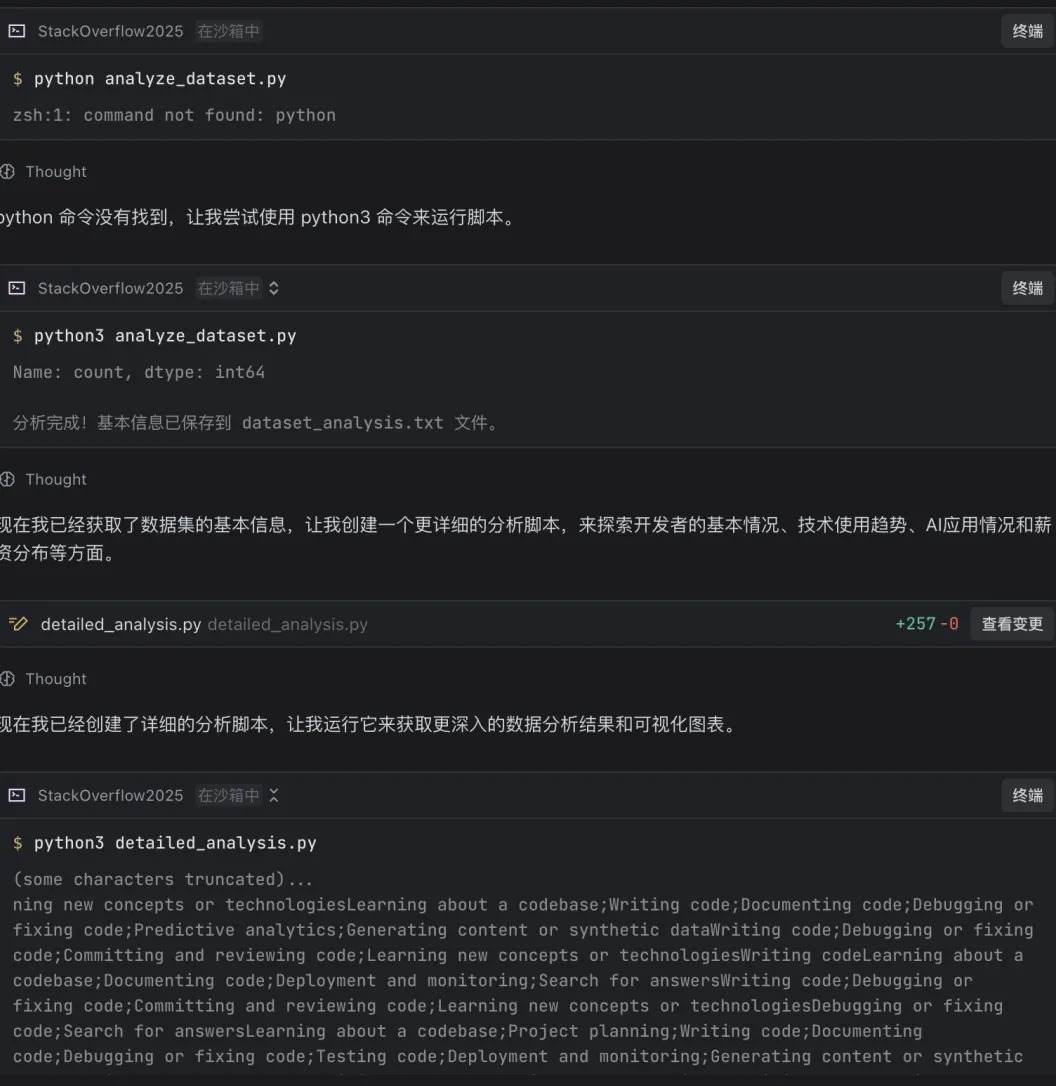 2. 从官网下载的数据是 zip 文件,无需人工手动解压,AI 自己会解压并使用 Python 来读取和分析数据;大概经过 2 分钟,AI 会显示初步分析结果,例如 数据基本情况、开发者画像、AI 工具使用情况、薪资情况以及技术使用情况等多个方面