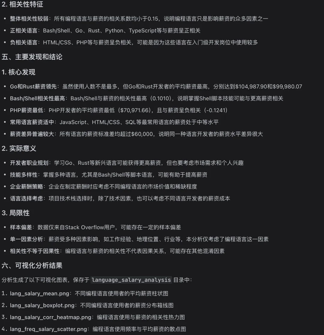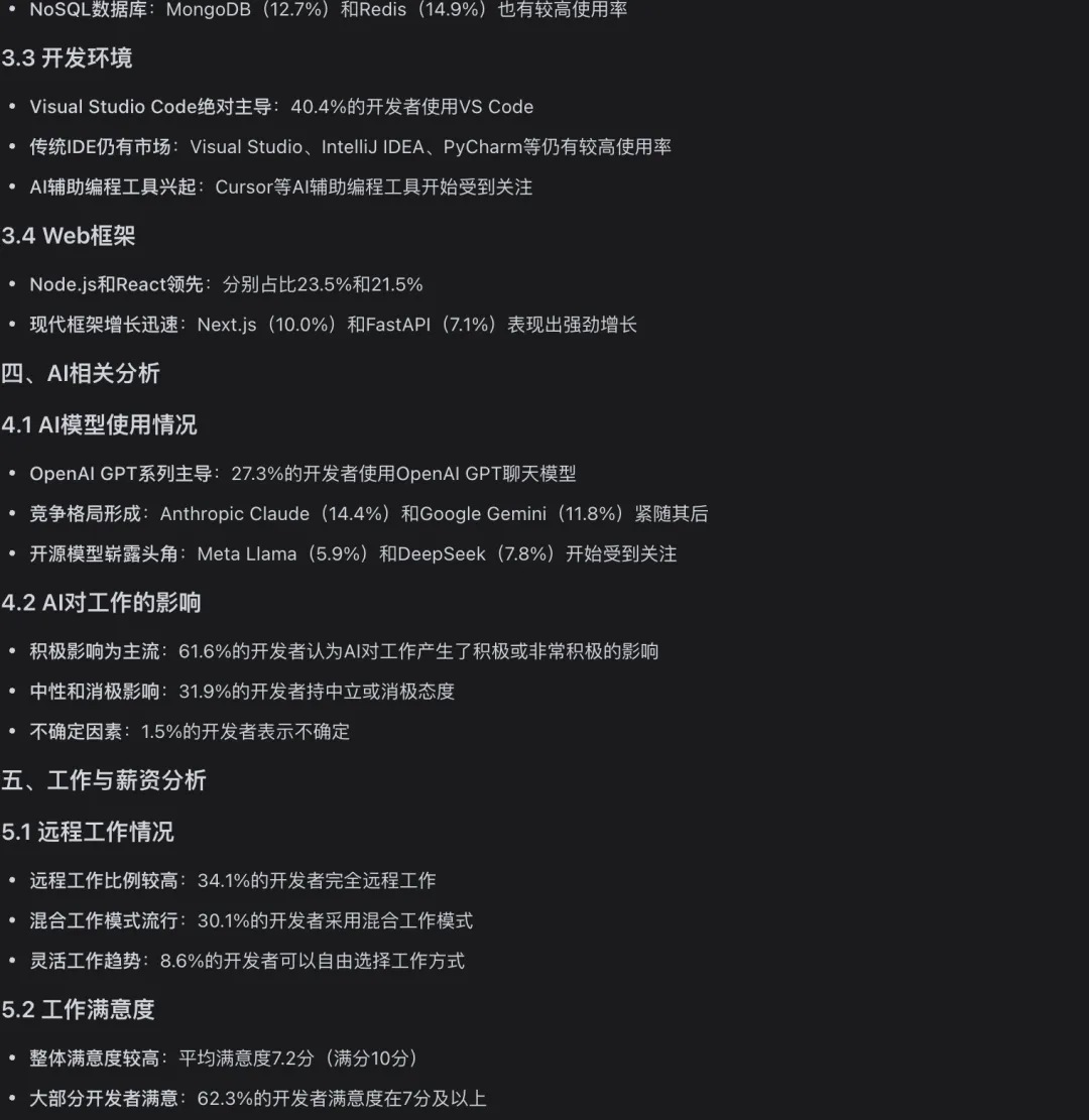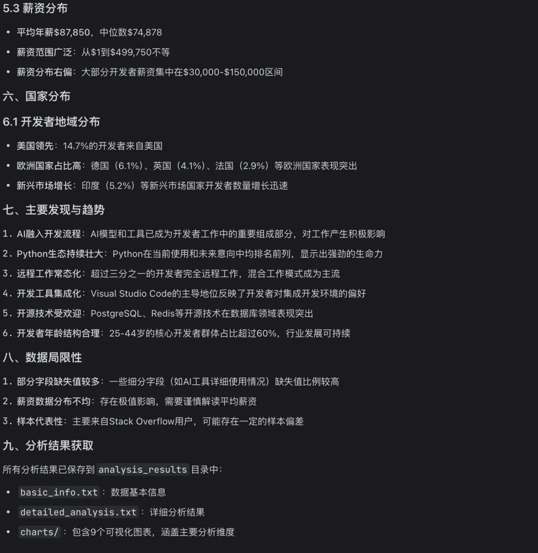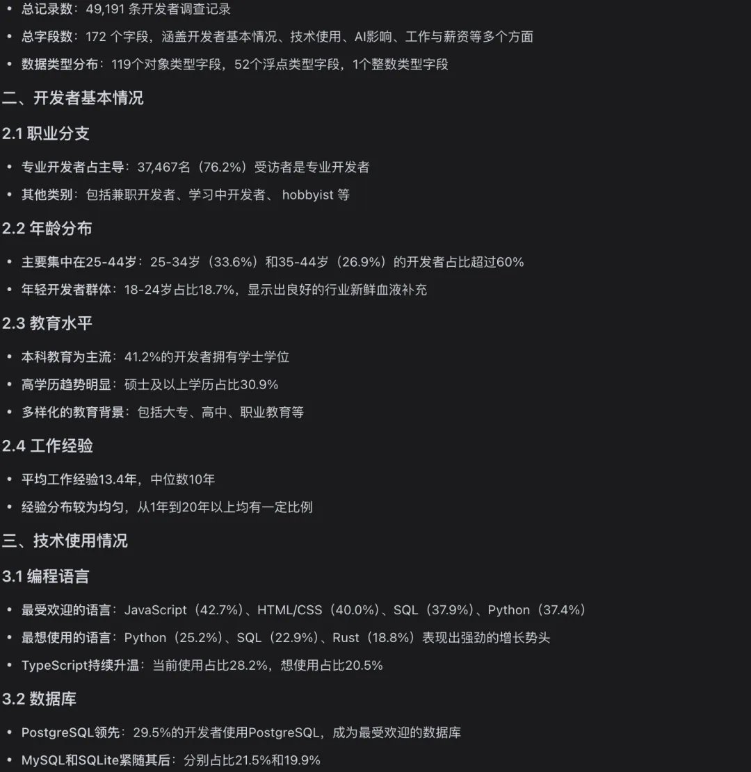 以上分析只是这个数据集的一部分,还有其他分析维度例如 AI 工具使用率分析、编程语言偏好分析、工具偏好与 AI 使用关联性等,大家可以自行修改提示词探索。