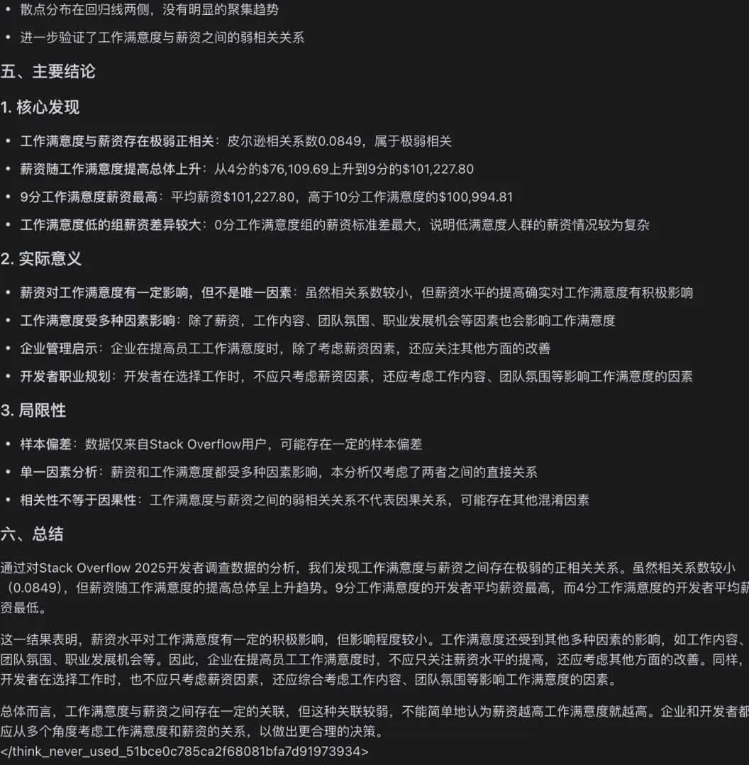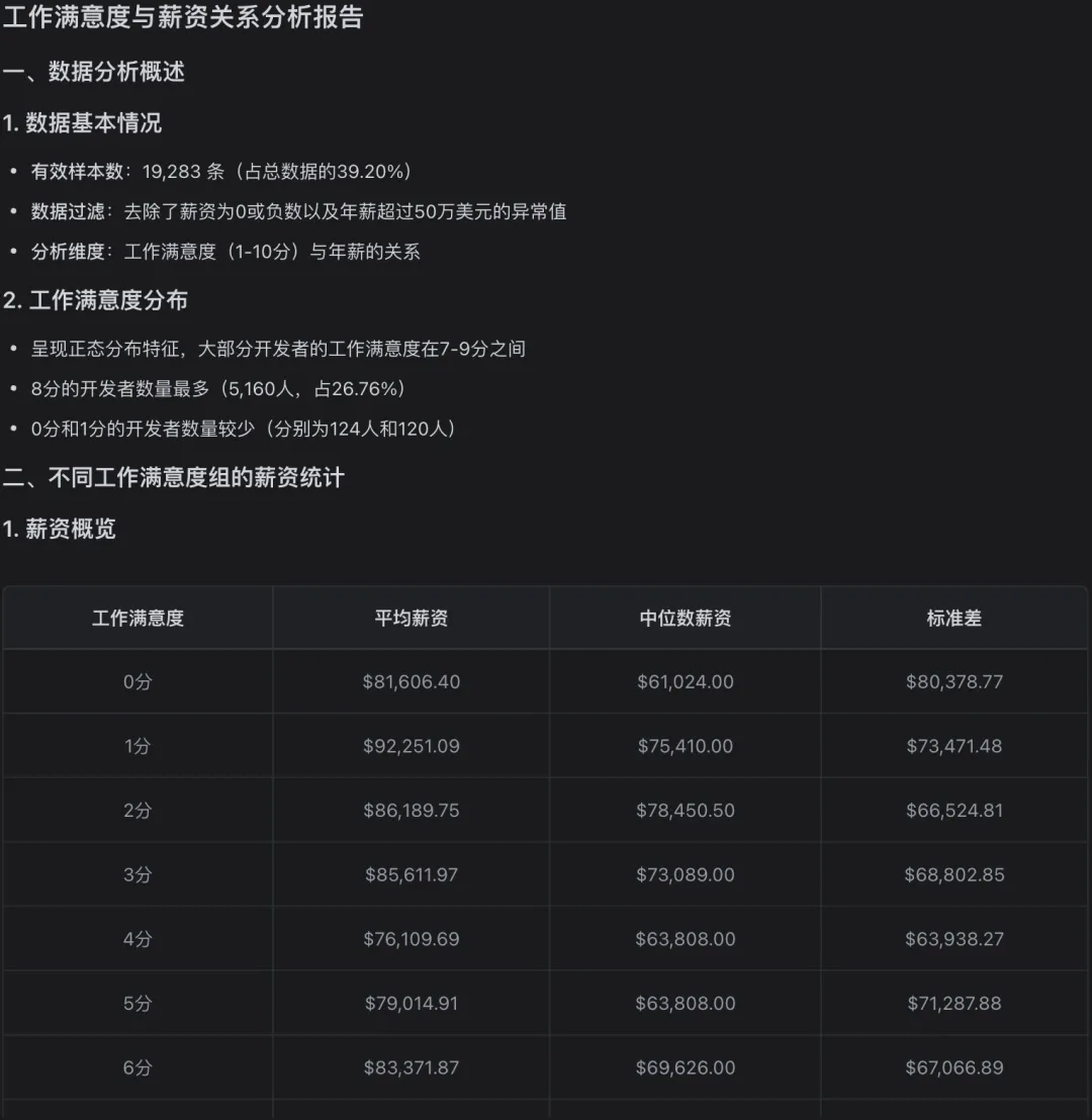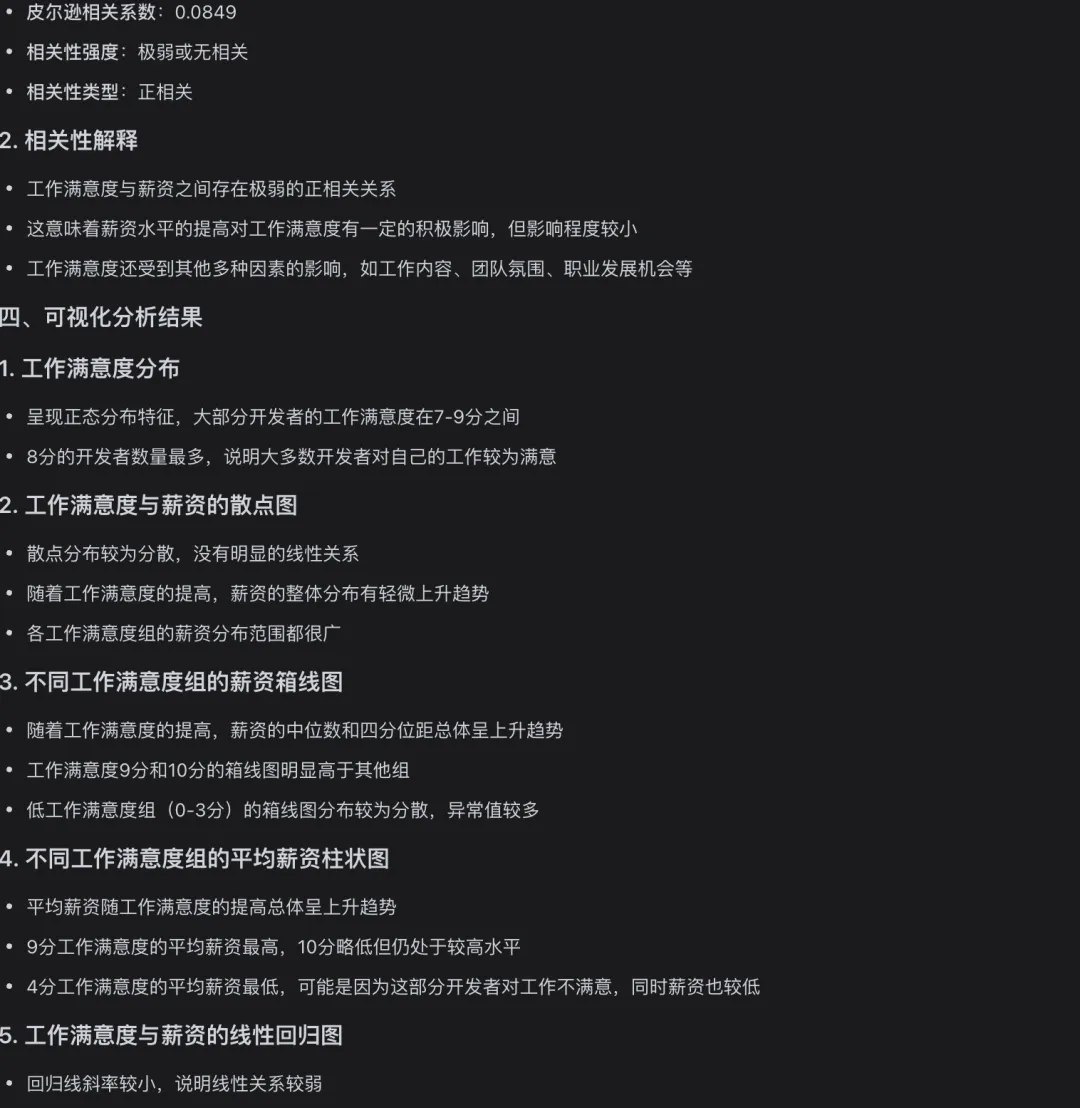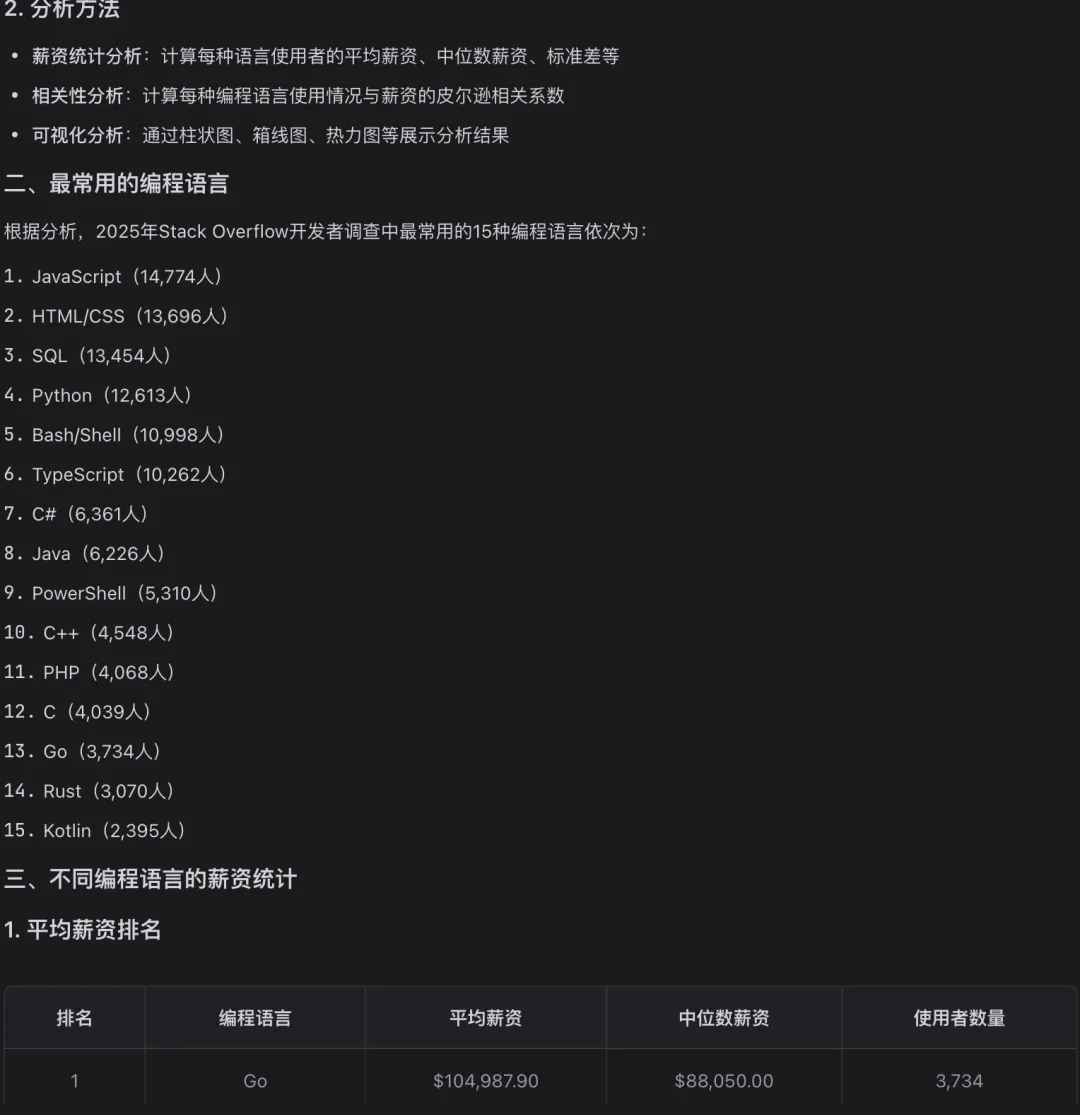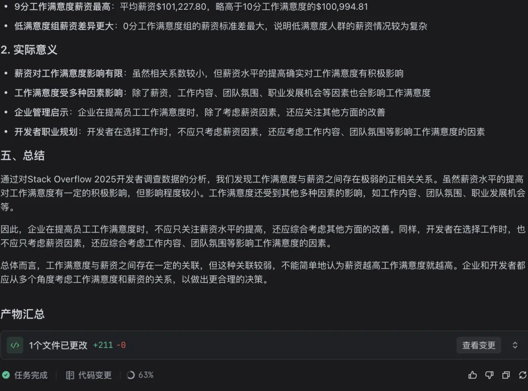 以上分析只是这个数据集的一部分,还有其他分析维度例如 AI 工具使用率分析、编程语言偏好分析、工具偏好与 AI 使用关联性等,大家可以自行修改提示词探索。