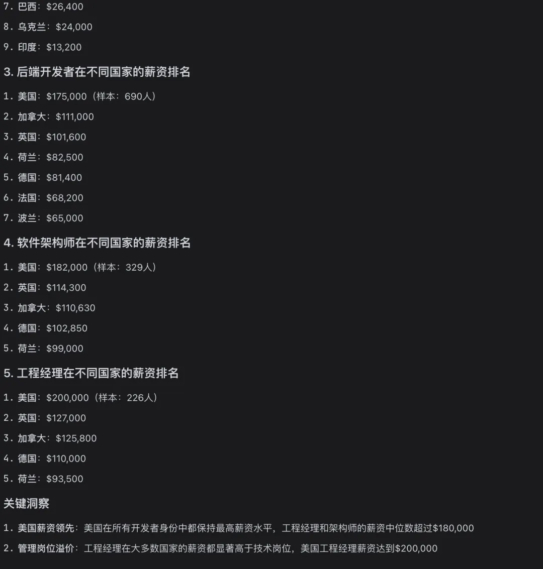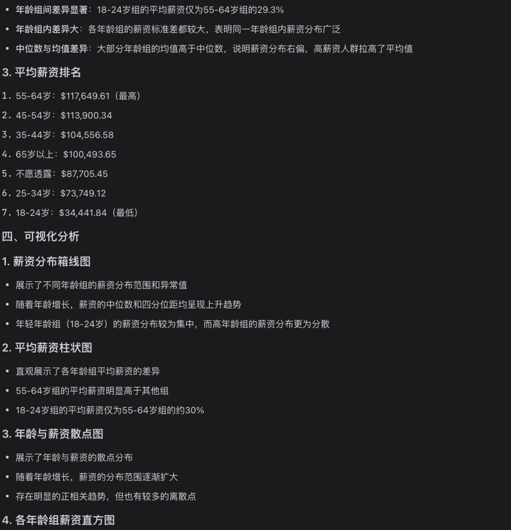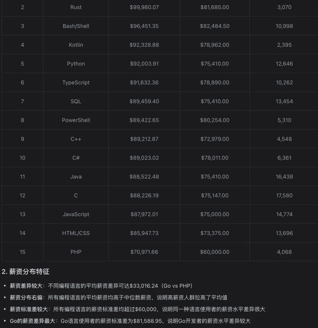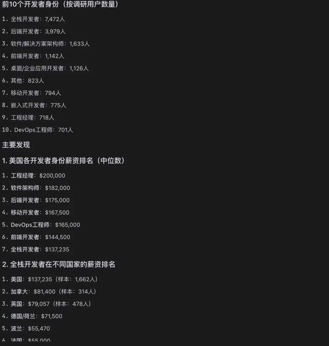 以上分析只是这个数据集的一部分,还有其他分析维度例如 AI 工具使用率分析、编程语言偏好分析、工具偏好与 AI 使用关联性等,大家可以自行修改提示词探索。