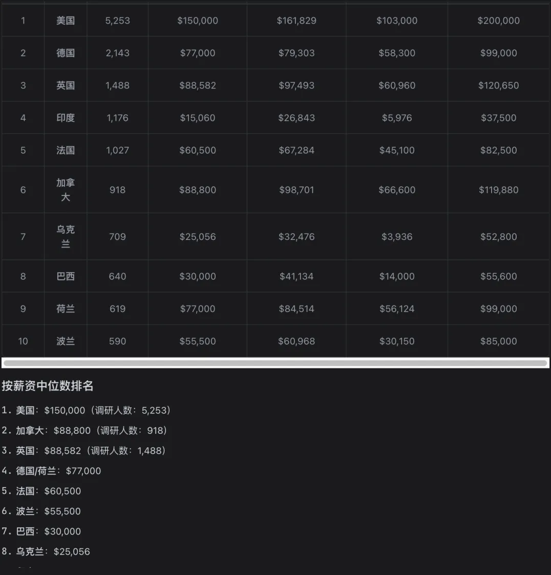 「分析一下不同国家的薪资分布(看一下前10国家,按调研用户数量排序,薪资中位数,均值和25/75分位数,全部换算为美金)」