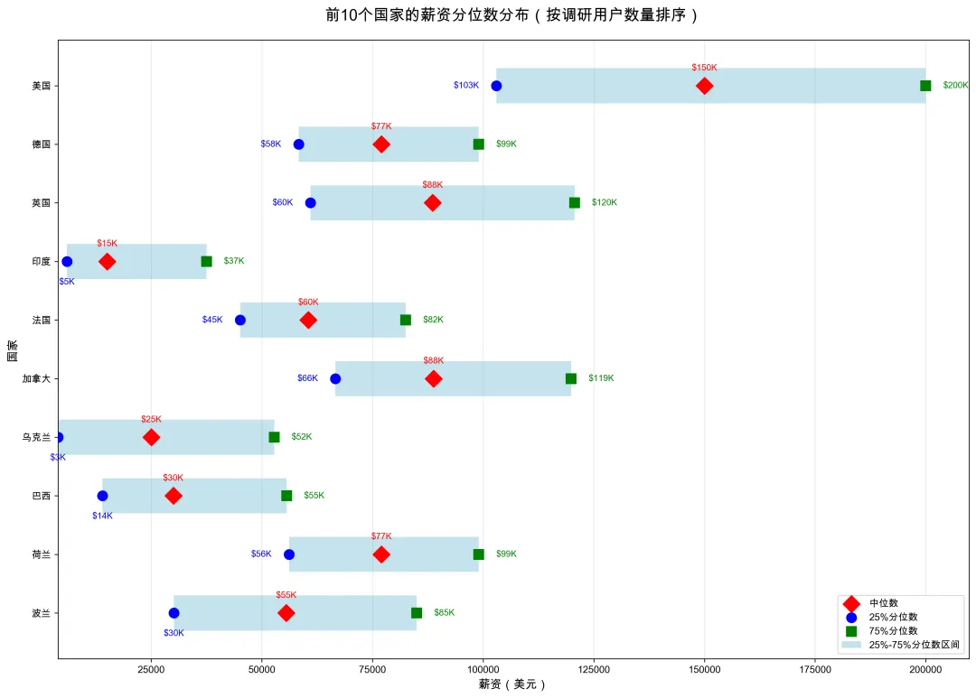 「帮我画一个图,展示每个国家的25/75/中位数 薪资,只需要展示前10国家即可」