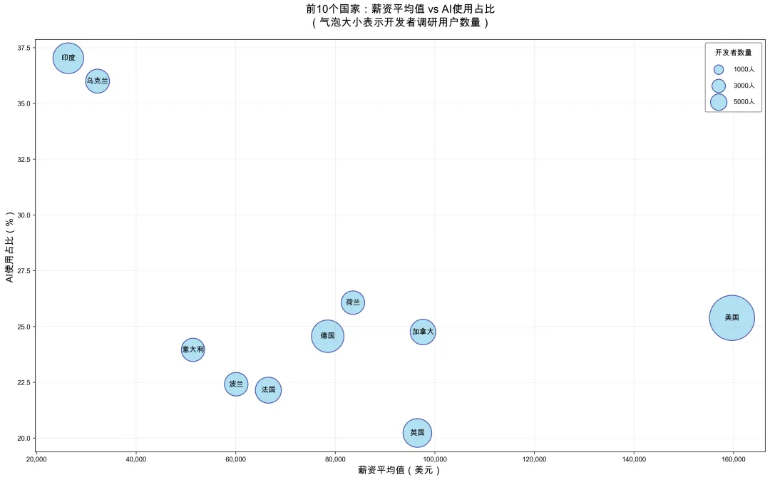 「帮我画一个气泡图,横轴是薪资均值(单位是美金),数轴是每日使用过AI的占比,大小是开发者调研用户数量,展示前10国家,气泡大小适中,注意美观」