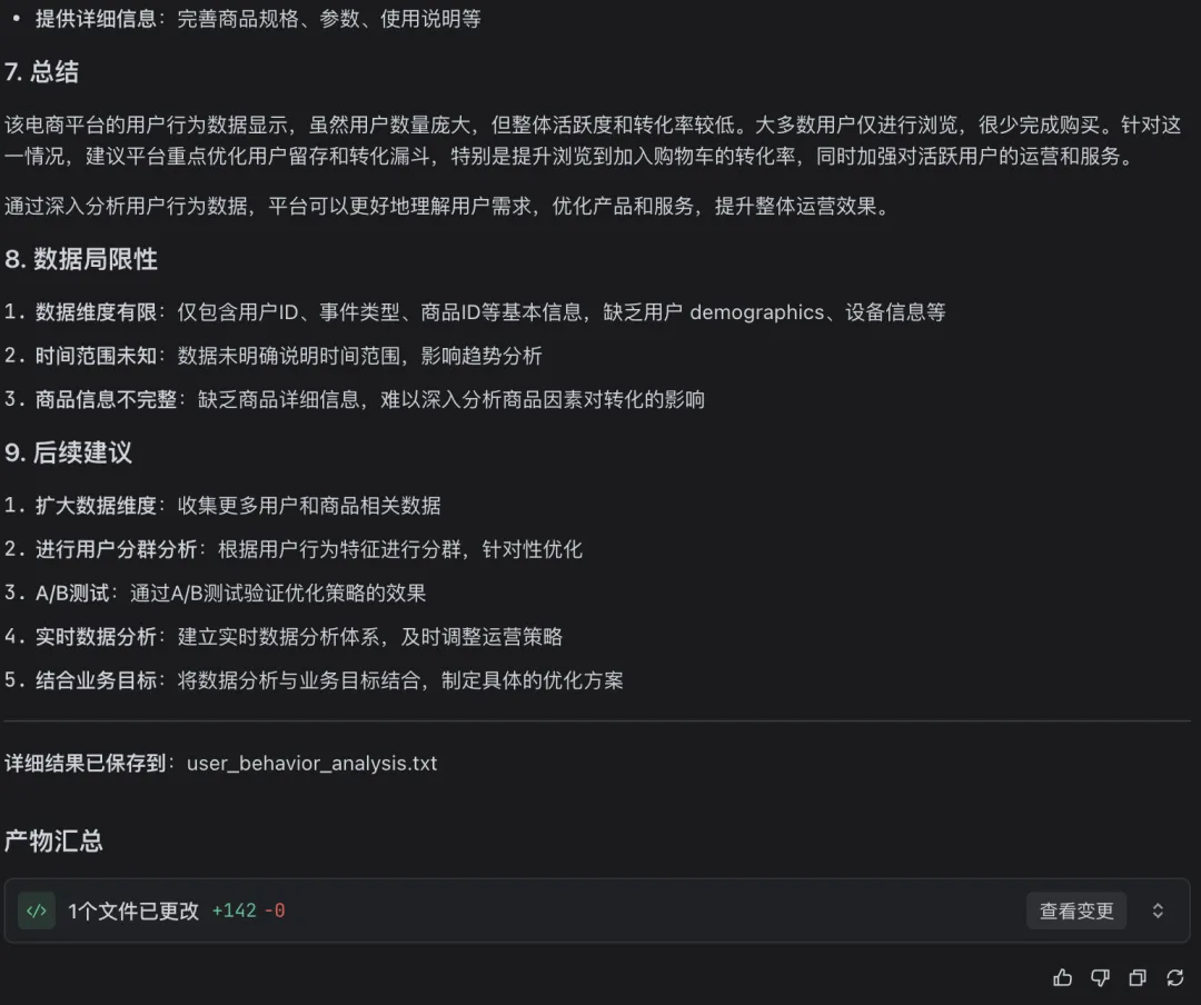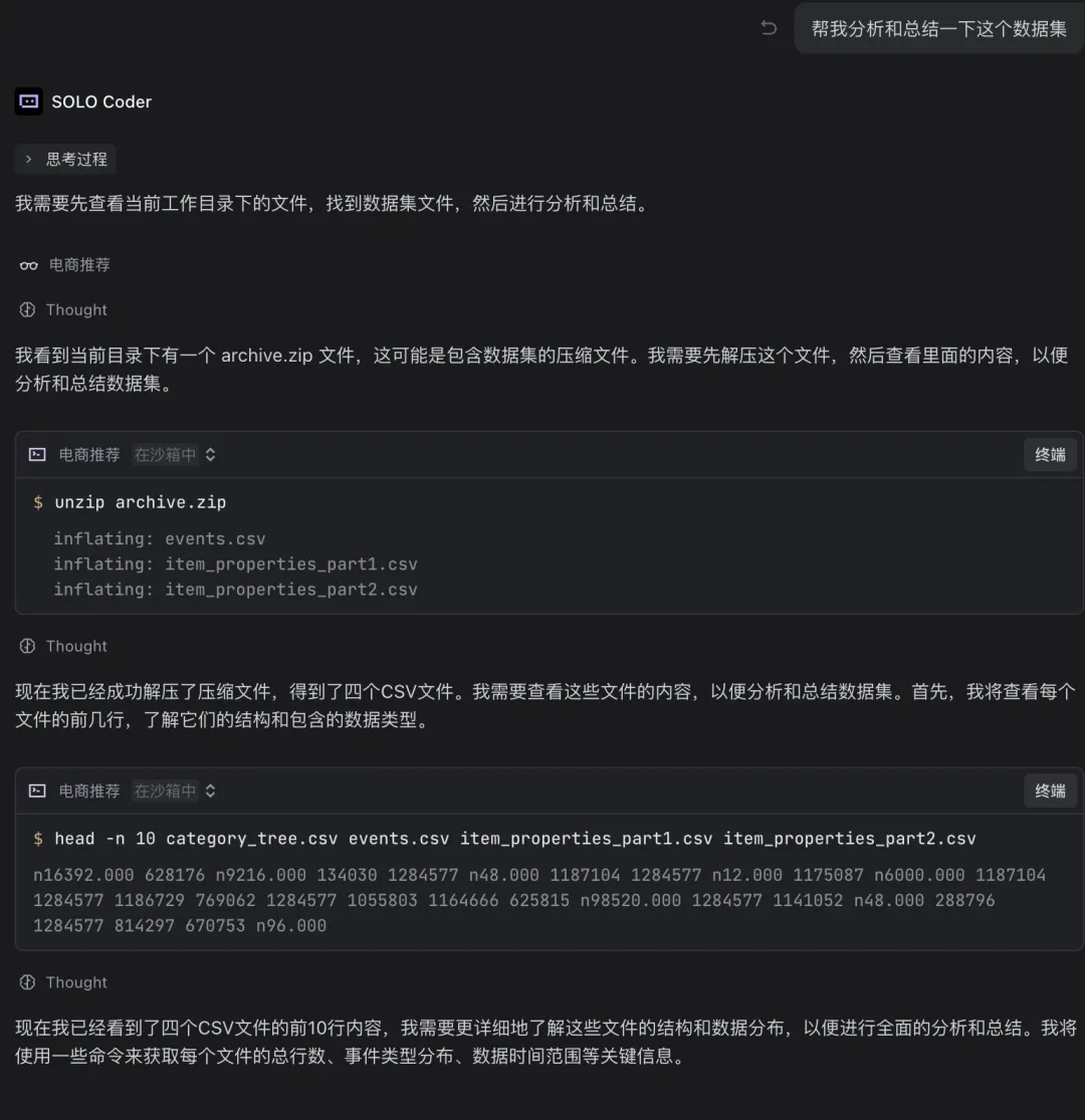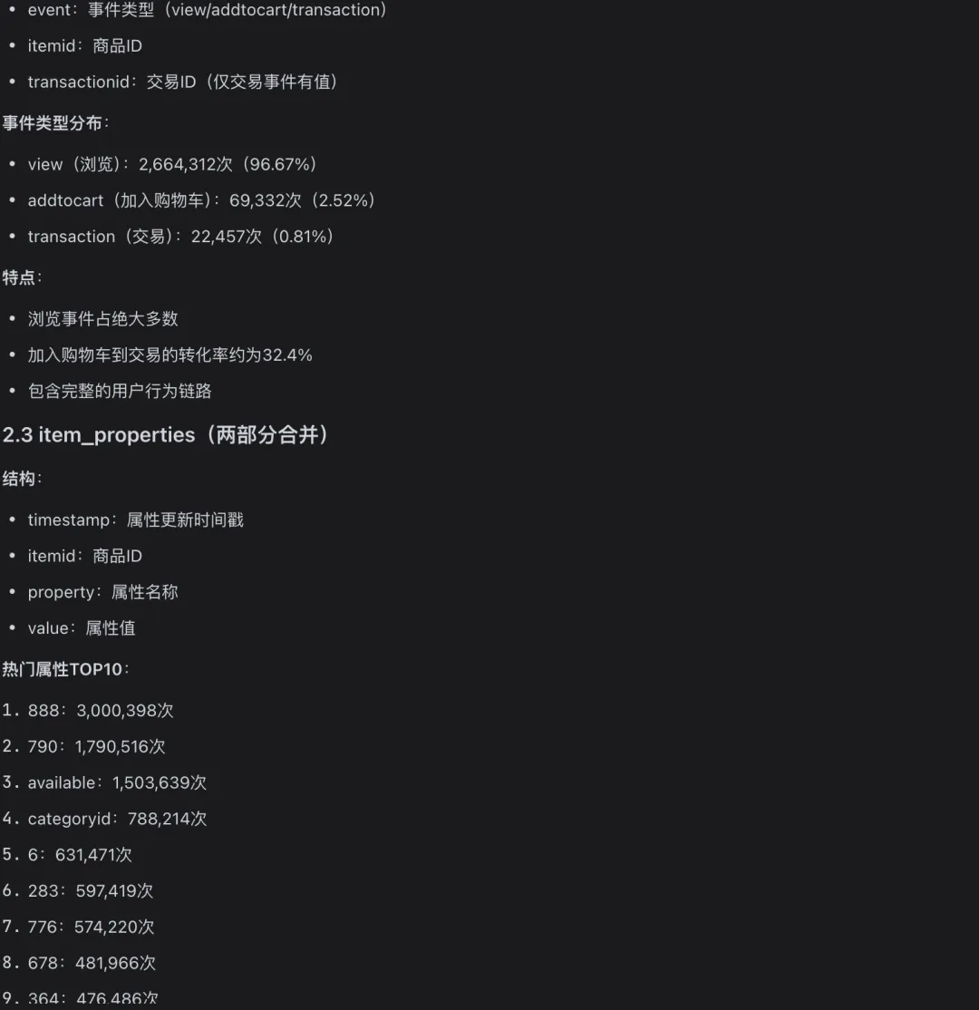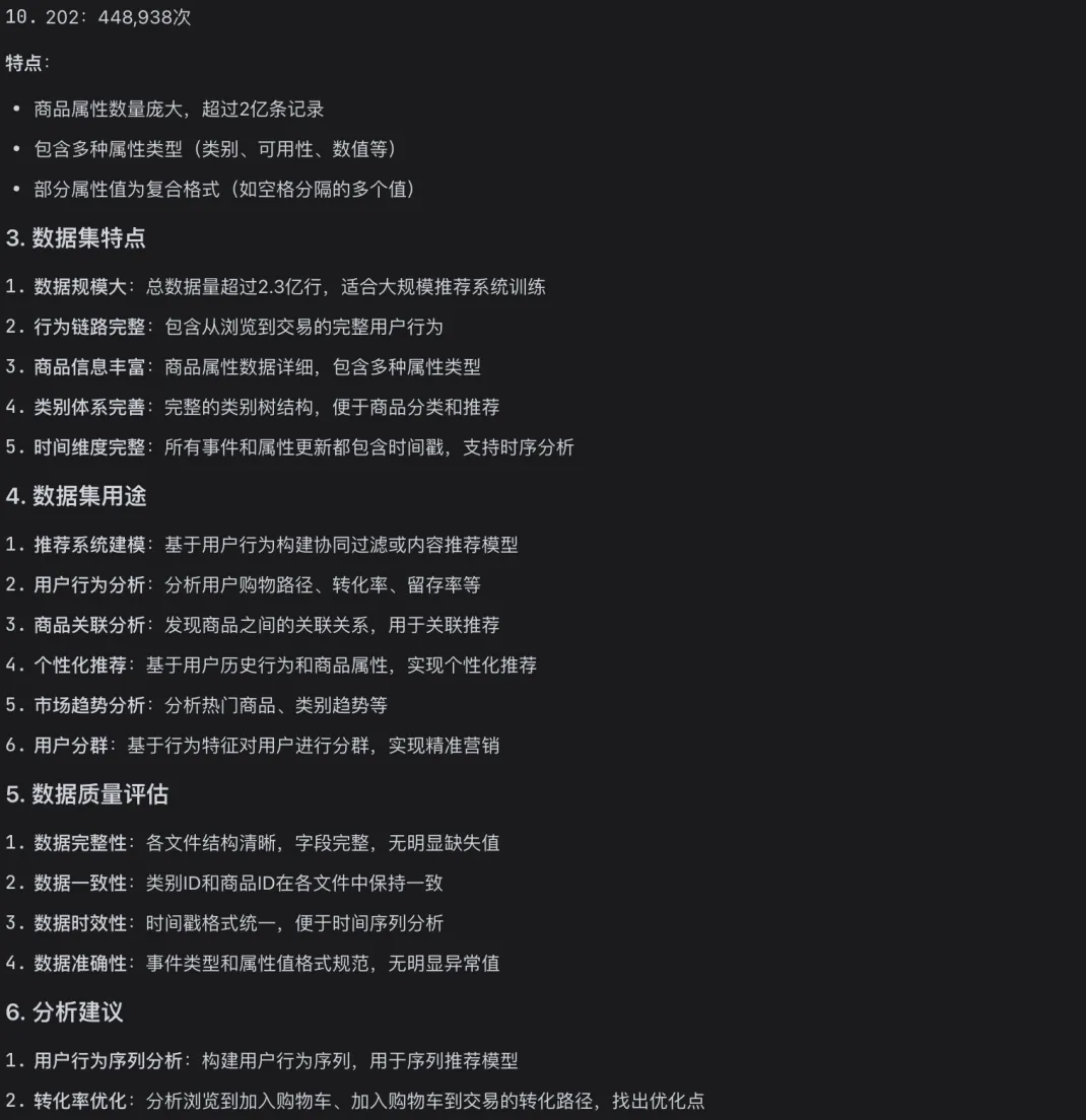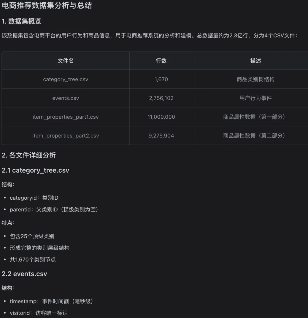 1. 直接在对话框里输入指令,指令可以简单(例如“帮我分析和总结一下这个数据集”);可以看到三个文件里,ategory_tree.csv 是商品类别树结构(1670 行);events.csv 是户行为事件(276 万行),主要是三类事情:浏览、加入购物车和交易;item_properties 是商品属性(2000 万行),包含多种属性类型