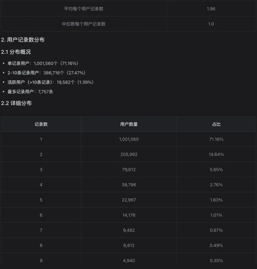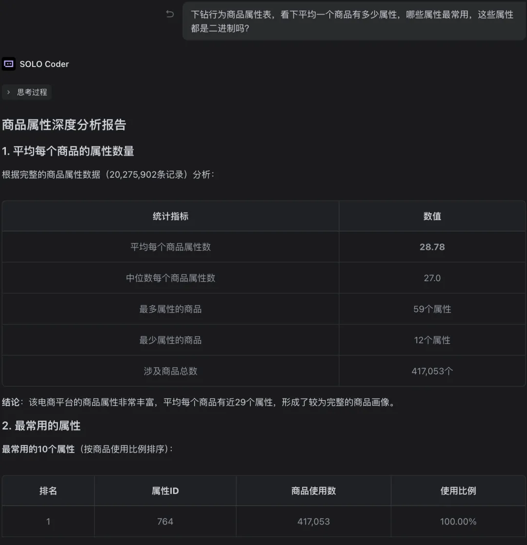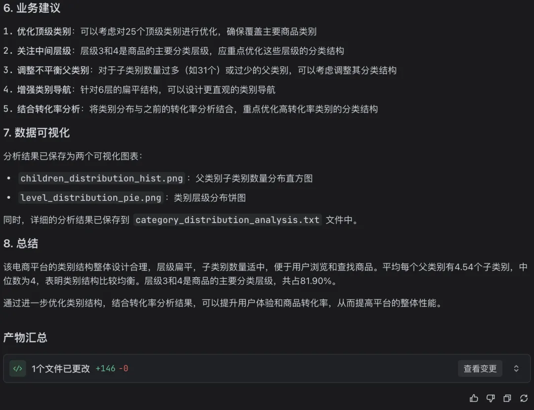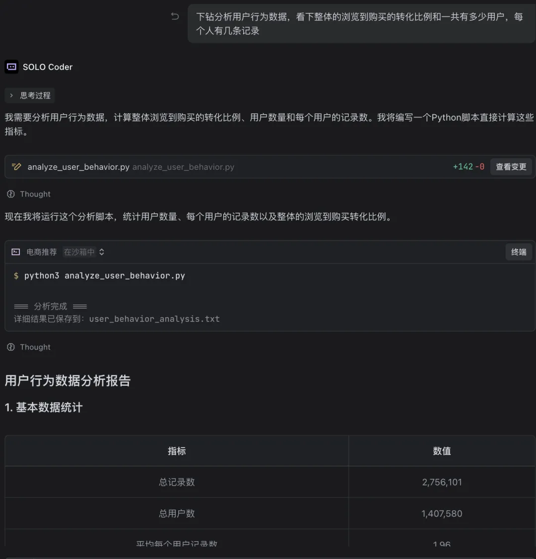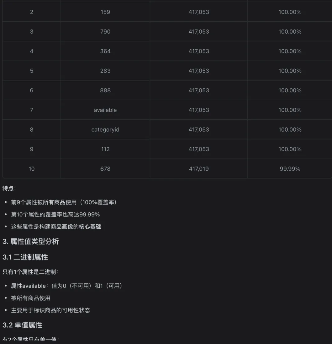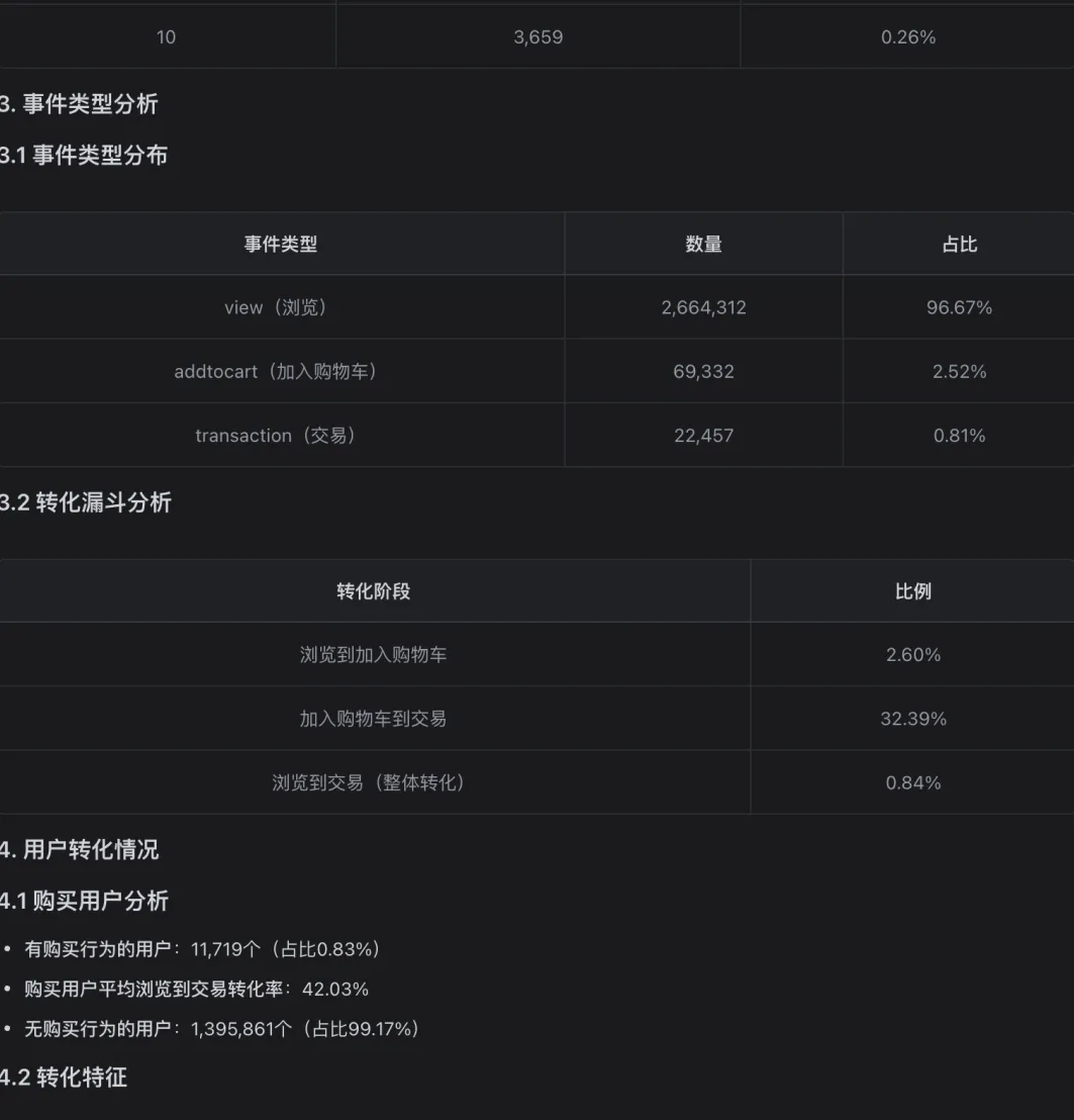 1. 直接在对话框里输入指令,指令可以简单(例如“帮我分析和总结一下这个数据集”);可以看到三个文件里,ategory_tree.csv 是商品类别树结构(1670 行);events.csv 是户行为事件(276 万行),主要是三类事情:浏览、加入购物车和交易;item_properties 是商品属性(2000 万行),包含多种属性类型