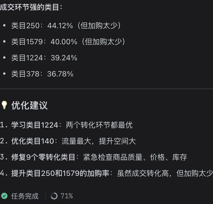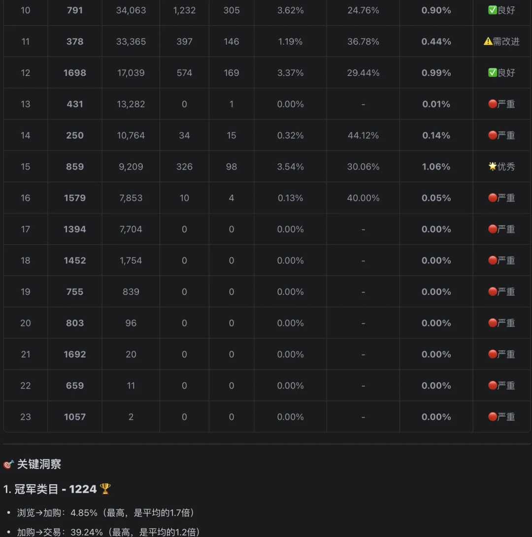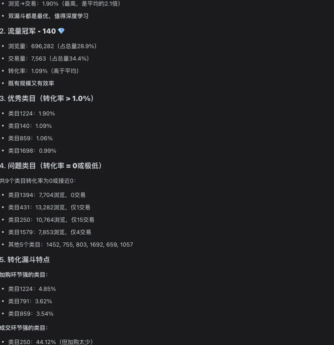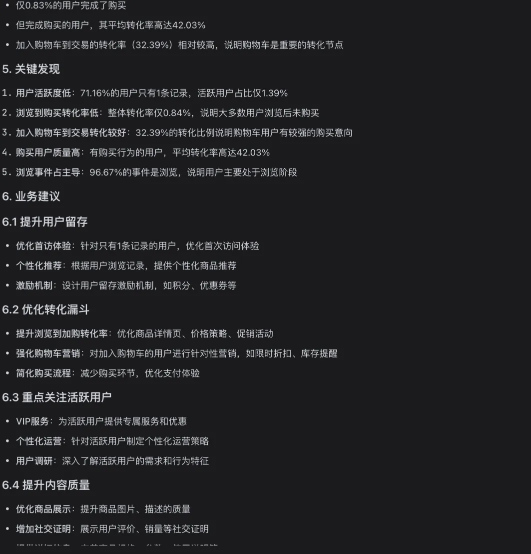 以上分析只是这个数据集的一部分,还有其他分析维度例如其他属性对购买转化比例的影响等,大家可以自行修改提示词探索。
