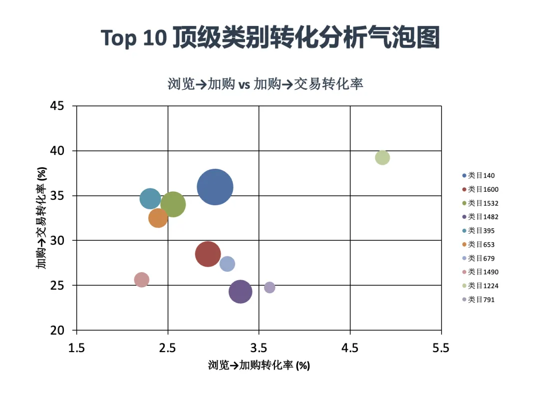 「帮我画一个气泡图,横轴浏览到加购的转化,竖轴是加购到购买的转化,大小是浏览量级,只需要画按浏览量前10个顶级类别」
