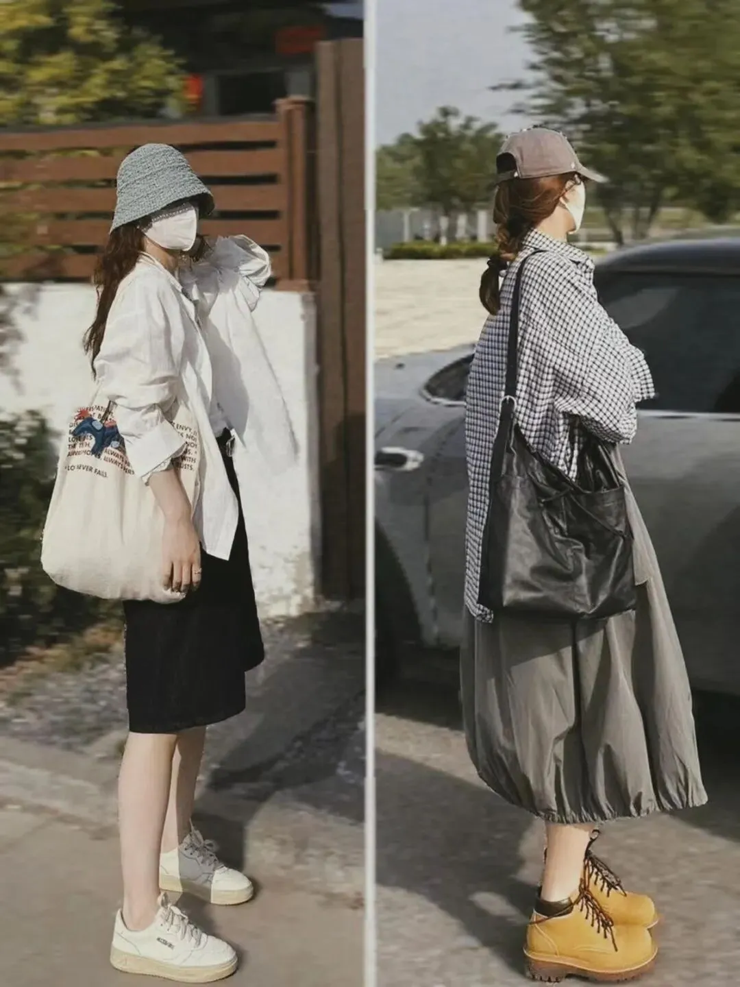 左边更不挑人,是日系温柔范本。精髓在 “白衬衫只塞一侧衣角” ——前面看显比例,后面看遮屁股,对梨形身材友好到哭。加上灰蓝渔夫帽和黑白内搭,整体是低饱和的莫兰迪色调,视觉上极度舒适。