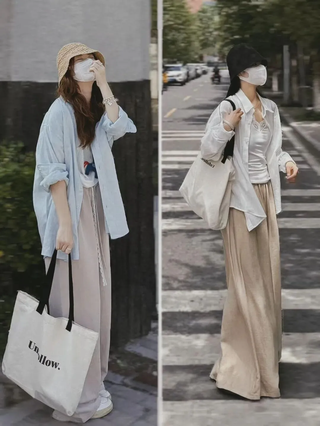 左边是 “懒人物理增高术”。垂感拖地裤+厚底鞋,裤长盖住脚面,身高全靠鞋底暗戳戳助力。戴上草编帽,营造“我随便穿穿就这么显高”的轻松假象。