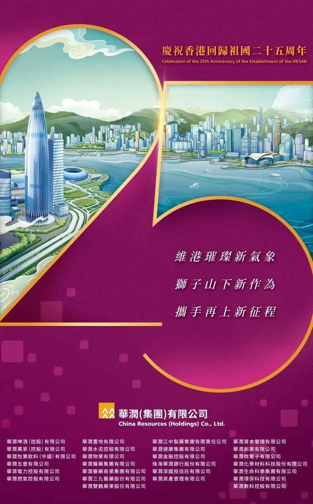 为庆祝回归周年的庆典时刻,华润集团特别制作专题节庆海报,将满满的祝福挂满香港铜锣湾、旺角、尖沙咀等人气街道,并在多家权威纸媒、电子媒体刊登。官微也特别制作“献礼香港回归25周年”策划,推出了“探香港”等系列内容。与此同时,华润面向香港基层社区举办了“捐赠抗疫用品”、“爱心义诊”、“公益维修服务”等60多项庆祝活动与广大市民共同庆祝这一重要时刻。