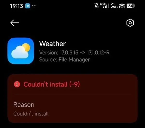 比如你想把天气应用从17.0.3.15升级到17.1.0.12-R,系统会毫不客气地甩给你一个“Couldn't install -9”的错误提示。