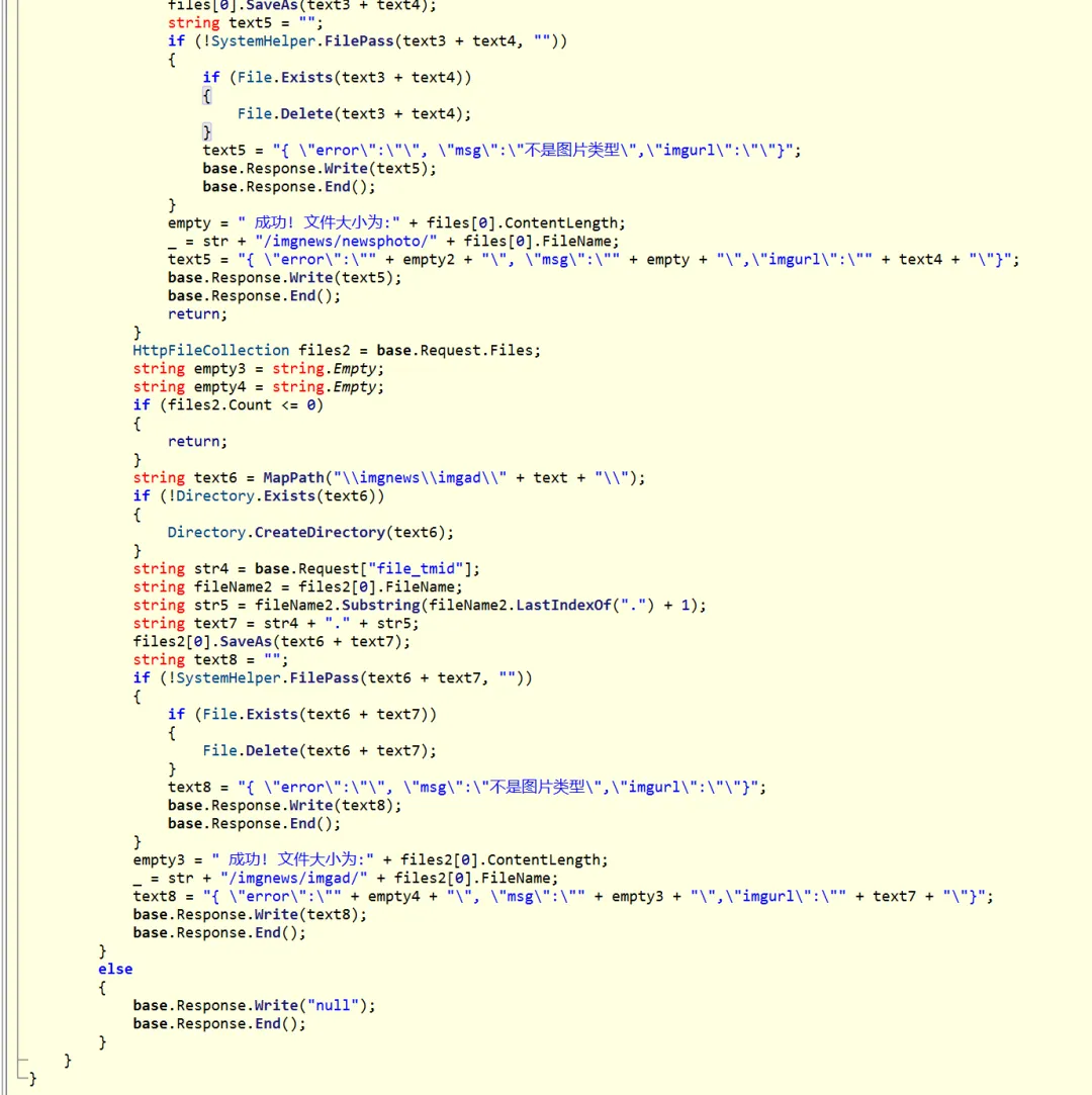 4.文件上传后,使用SystemHelper.FilePass方法检查文件是否为图片类型。如果不是,则删除文件并返回错误信息。