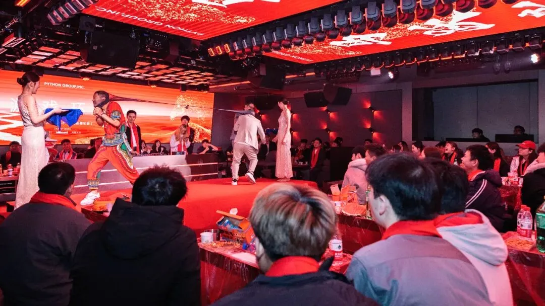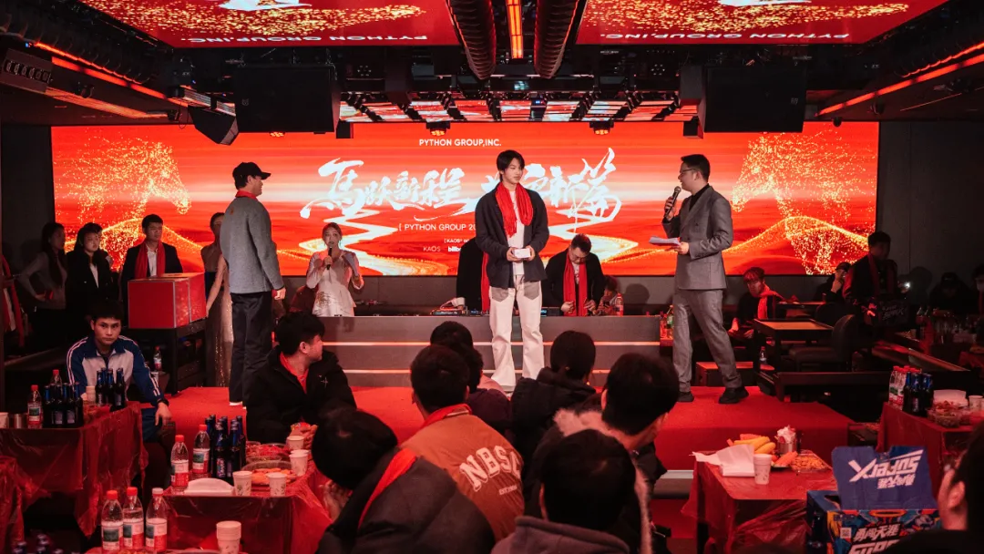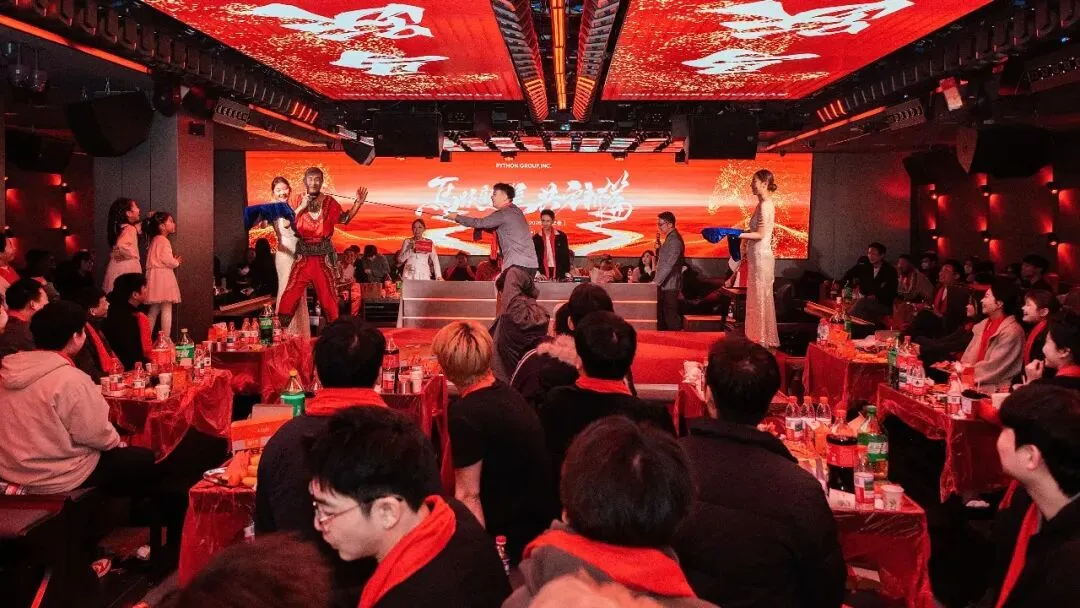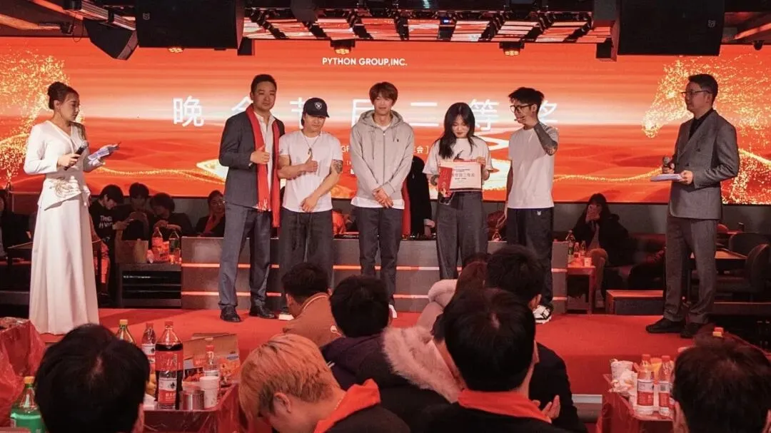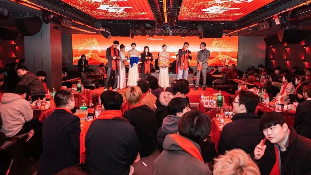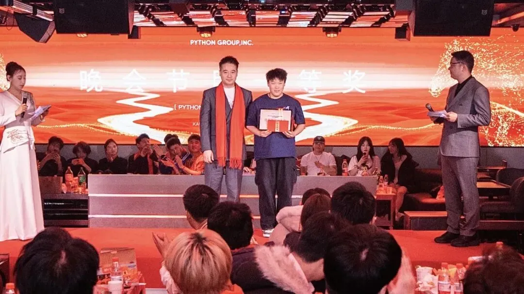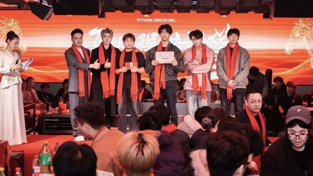 PYTHON GROUP人才济济,各部门精心准备的节目轮番上阵,精彩不断:销售部的吉他弹唱《蓝莲花》,歌声悠扬,触动人心;股东部的街舞《Funky Style》活力四射,引爆全场;礼宾部的小品《脑袋疼》笑点频出,掌声连连;厂牌部的《打劫》表演生动,剧情反转令人捧腹;PR部的《Always Online》、客服部的《当爱已成往事》深情演唱,感动满满;运营部的杂技《空竹》与情景剧《群演与导演》,更是展现团队的多才多艺与无限创意。