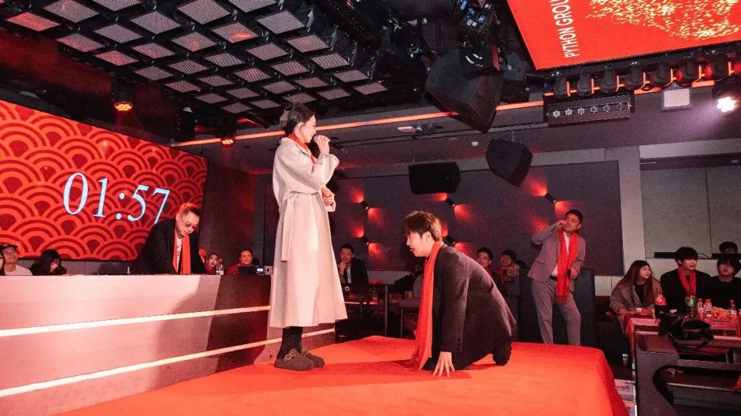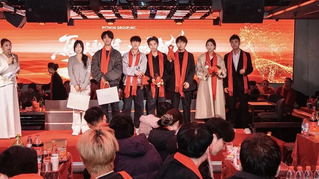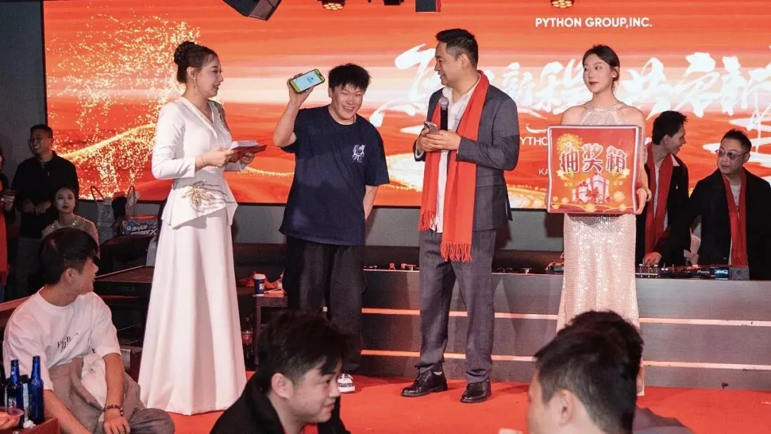 “徒手穿裤衩”“你比我猜”“蒙丝袜拔河吹蜡烛”——三大互动游戏将现场气氛推向一波又一波的高潮。台上选手拼尽全力,台下观众笑声连连,团结与欢乐在此刻交织。没有复杂的规则,只有参与游戏的快乐。不论是游戏胜利还是参与游戏的家人们,都有一份PYTHON GROUP并肩作战的激励,也是我们为 2026 年埋下的 “开年好运”。