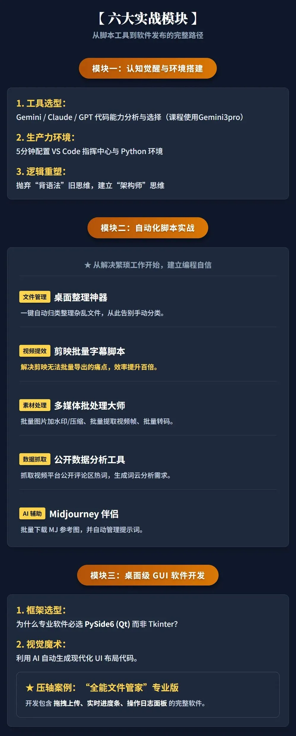 很多人问这次的课程到底要讲什么,其实就是讲如何通过Gemini3pro来进行各种实用脚本、各种桌面软件的开发,完全0代码,也无需任何基础。难度大概是学C4D的十分之一,所以如果问我需要什么基础,我的回答是不需要任何基础,无论编程还是英语。Gemini3pro作为当今世界综合能力最好的模型,而仅需每年几十块人民币就能使用,谷歌真的是当今互联网的赛博菩萨,大善人!Gemini3pro的强是多方面的,我们课程都会涉及,你会掌握Gemini3pro的方方面面。通过把自己的想法变成实实在在的产品,你会有一个感受是,觉得自己无比强大,很多困难都能找到方法。打开思维,开阔眼界,真正的让自己变成 AI思维。有了AI思维,你会掌握解决问题的能力,学什么都是事半功倍。--------------------