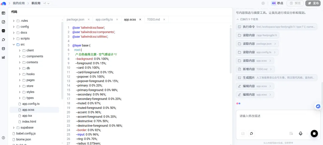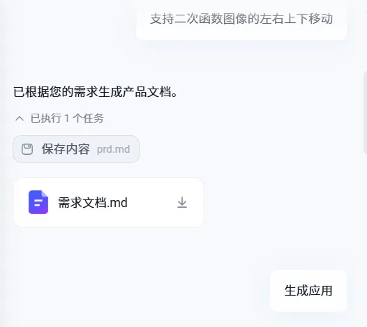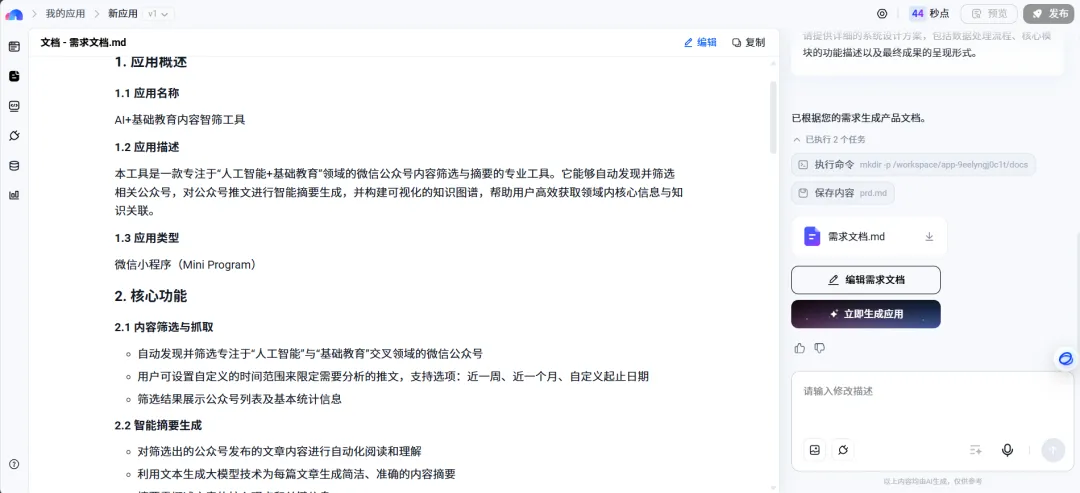 首先会生成需求文档,看一下没什么问题就开始生成应用