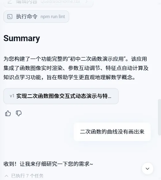 吐槽一下,秒哒生成应用时间真的很长,中间我跑出去吃了口饭,回来发现还在转圈圈。大概用了十多分钟,这个生成时间目前最好的估计就是飞象老师了,其次是灵光。发现生成的结果没有曲线,于是很直白地说:二次函数的曲线没有画出来。秒哒就又开始转圈圈了。