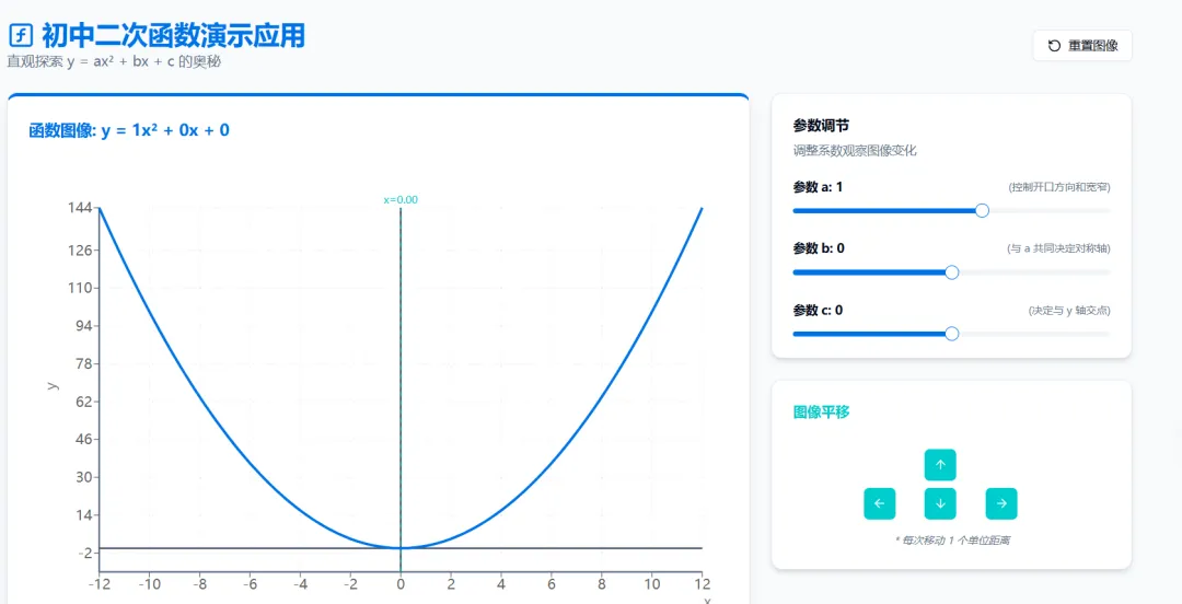 请制作一个初中二次函数的演示应用 支持二次函数图像的左右上下移动 生成应用
