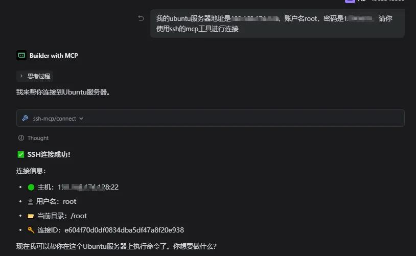 什么是ssh-mcp。简单点来说就是你在trae里直接对话,就可以远程操作你的linux系统了,再也不用为那一堆报错挠头了