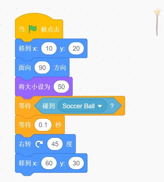 (7)当角色Soccer Ball碰到Wand即命中后,等待0.1秒,Wand右转45°,移动到坐标(X=60,Y=30)。