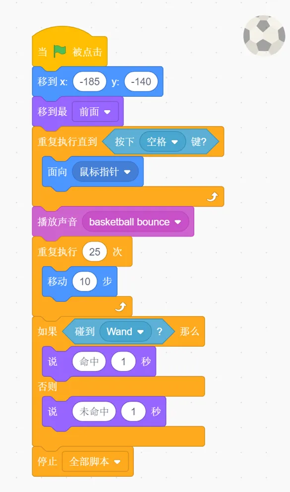 (6)移动过后,如果碰到Wand,角色Soccer Ball说“命中”1秒,否则说“未命中”1秒,停止全部脚本。