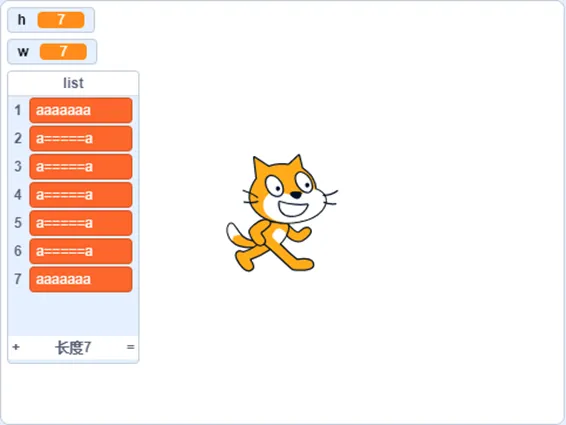 输入:h = 6,w = 7输出:list = ['aaaaaaa', 'a=====a', 'a=====a', 'a=====a', 'a=====a', 'aaaaaaa']【测试用例5】