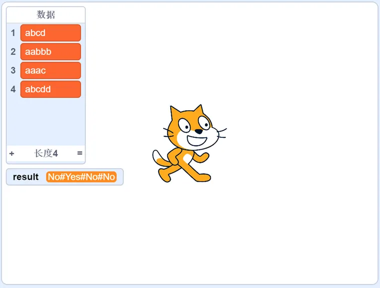 输入:数据 = ['aabbb', 'abcd', 'aaac']输出:result = Yes#No#No【测试用例4】