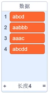 数据 = ['abcd', 'aabbb', 'aaac', 'abcdd']【输出样例】