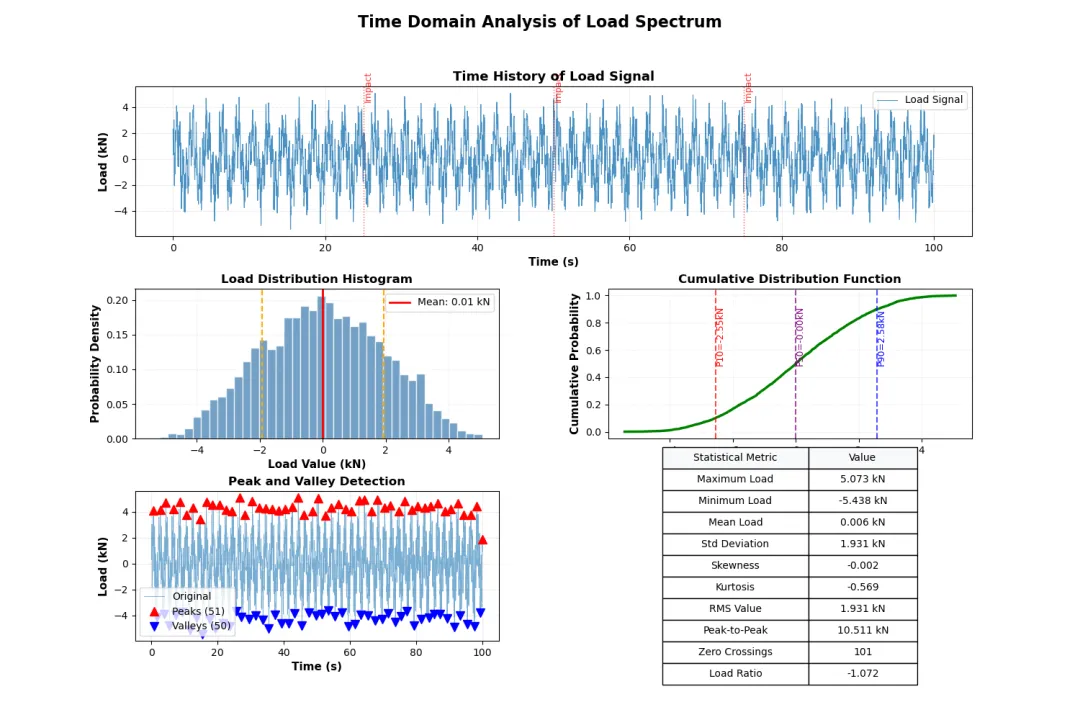 def create_time_domain_plots(df): """创建时域分析图表""" fig = plt.figure(figsize=(15, 10)) gs = GridSpec(3, 2, figure=fig, hspace=0.35, wspace=0.3) # 1. 原始载荷时间历程 ax1 = fig.add_subplot(gs[0, :]) ax1.plot(df['Time_s'], df['Load_kN'], linewidth=0.8, alpha=0.8, label='Load Signal') ax1.set_xlabel('Time (s)', fontweight='semibold') ax1.set_ylabel('Load (kN)', fontweight='semibold') ax1.set_title('Time History of Load Signal', fontsize=13, fontweight='bold') ax1.grid(True, alpha=0.3, linestyle='--') ax1.legend(loc='upper right') # 标记冲击事件 impact_times = [25, 50, 75] for t_imp in impact_times: ax1.axvline(x=t_imp, color='red', linestyle=':', alpha=0.7, linewidth=1) ax1.text(t_imp, df['Load_kN'].max()*0.9, 'Impact', rotation=90, fontsize=9, color='red', alpha=0.8) # 2. 载荷统计直方图 ax2 = fig.add_subplot(gs[1, 0]) hist_values, bins, patches = ax2.hist(df['Load_kN'], bins=40, edgecolor='white', alpha=0.75, color='steelblue', density=True) # 添加统计线 mean_val = df['Load_kN'].mean() std_val = df['Load_kN'].std() ax2.axvline(mean_val, color='red', linestyle='-', linewidth=2, label=f'Mean: {mean_val:.2f} kN') ax2.axvline(mean_val + std_val, color='orange', linestyle='--', linewidth=1.5) ax2.axvline(mean_val - std_val, color='orange', linestyle='--', linewidth=1.5) ax2.set_xlabel('Load Value (kN)', fontweight='semibold') ax2.set_ylabel('Probability Density', fontweight='semibold') ax2.set_title('Load Distribution Histogram', fontsize=12, fontweight='bold') ax2.legend() ax2.grid(True, alpha=0.3, linestyle=':') # 3. 累积分布函数 ax3 = fig.add_subplot(gs[1, 1]) sorted_load = np.sort(df['Load_kN']) cdf = np.arange(1, len(sorted_load) + 1) / len(sorted_load) ax3.plot(sorted_load, cdf, linewidth=2.5, color='green') # 标记关键百分位点 percentiles = [10, 50, 90] colors = ['red', 'purple', 'blue'] for p, color in zip(percentiles, colors): p_value = np.percentile(df['Load_kN'], p) ax3.axvline(p_value, color=color, linestyle='--', alpha=0.7) ax3.text(p_value, 0.5, f'P{p}={p_value:.2f}kN', rotation=90, fontsize=9, color=color) ax3.set_xlabel('Load Value (kN)', fontweight='semibold') ax3.set_ylabel('Cumulative Probability', fontweight='semibold') ax3.set_title('Cumulative Distribution Function', fontsize=12, fontweight='bold') ax3.grid(True, alpha=0.3, linestyle=':') # 4. 载荷极值识别 ax4 = fig.add_subplot(gs[2, 0]) # 寻找波峰和波谷 peak_indices, peak_properties = signal.find_peaks(df['Load_kN'], height=1.5, distance=80, prominence=0.5) valley_indices, valley_properties = signal.find_peaks(-df['Load_kN'], height=1.5, distance=80, prominence=0.5) ax4.plot(df['Time_s'], df['Load_kN'], linewidth=0.6, alpha=0.6, label='Original') ax4.plot(df['Time_s'].iloc[peak_indices], df['Load_kN'].iloc[peak_indices], '^', markersize=8, color='red', label=f'Peaks ({len(peak_indices)})') ax4.plot(df['Time_s'].iloc[valley_indices], df['Load_kN'].iloc[valley_indices], 'v', markersize=8, color='blue', label=f'Valleys ({len(valley_indices)})') ax4.set_xlabel('Time (s)', fontweight='semibold') ax4.set_ylabel('Load (kN)', fontweight='semibold') ax4.set_title('Peak and Valley Detection', fontsize=12, fontweight='bold') ax4.legend() ax4.grid(True, alpha=0.3, linestyle='--') # 5. 统计摘要表格 ax5 = fig.add_subplot(gs[2, 1]) ax5.axis('off') # 计算统计指标 stats_summary = [ ['Maximum Load', f"{df['Load_kN'].max():.3f} kN"], ['Minimum Load', f"{df['Load_kN'].min():.3f} kN"], ['Mean Load', f"{df['Load_kN'].mean():.3f} kN"], ['Std Deviation', f"{df['Load_kN'].std():.3f} kN"], ['Skewness', f"{df['Load_kN'].skew():.3f}"], ['Kurtosis', f"{df['Load_kN'].kurtosis():.3f}"], ['RMS Value', f"{np.sqrt(np.mean(df['Load_kN']**2)):.3f} kN"], ['Peak-to-Peak', f"{df['Load_kN'].max()-df['Load_kN'].min():.3f} kN"], ['Zero Crossings', f"{len(peak_indices)+len(valley_indices)}"], ['Load Ratio', f"{df['Load_kN'].min()/df['Load_kN'].max():.3f}"] ] # 创建表格 table = ax5.table(cellText=stats_summary, colLabels=['Statistical Metric', 'Value'], cellLoc='center', loc='center', colWidths=[0.4, 0.3], colColours=['#f8f9fa', '#f8f9fa']) table.auto_set_font_size(False) table.set_fontsize(10) table.scale(1, 1.8) plt.suptitle('Time Domain Analysis of Load Spectrum', fontsize=16, fontweight='bold', y=0.98) plt.tight_layout() return figfig_time = create_time_domain_plots(load_df)plt.savefig('time_domain_analysis.png', bbox_inches='tight', dpi=150)plt.show()