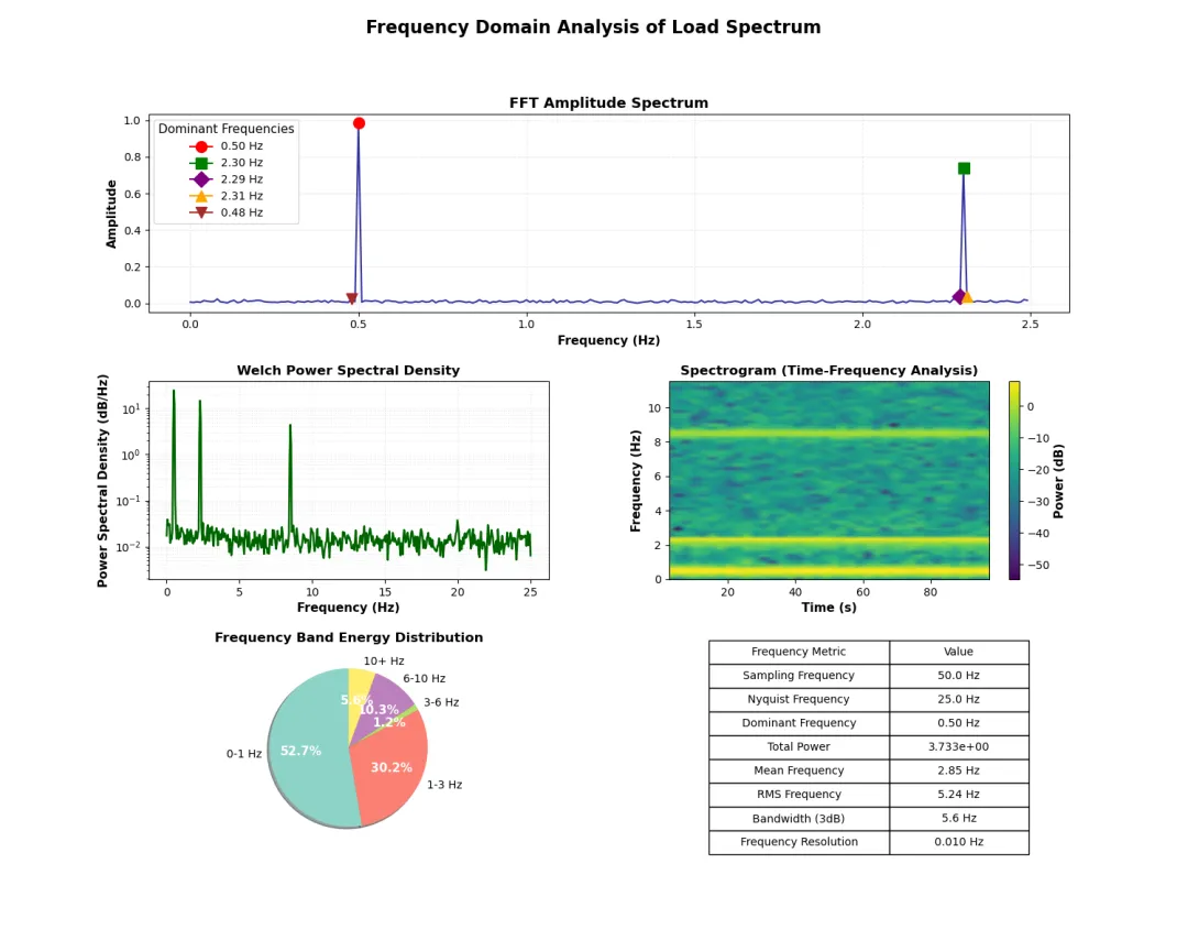def create_frequency_domain_plots(df): """创建频域分析图表""" fig = plt.figure(figsize=(15, 12)) gs = GridSpec(3, 2, figure=fig, hspace=0.35, wspace=0.3) # 计算FFT参数 N = len(df['Load_kN']) sampling_freq = N / df['Time_s'].iloc[-1] freq = np.fft.fftfreq(N, 1/sampling_freq)[:N//2] fft_values = np.fft.fft(df['Load_kN']) magnitude = np.abs(fft_values[:N//2]) / N phase = np.angle(fft_values[:N//2]) # 1. FFT幅度谱 ax1 = fig.add_subplot(gs[0, :]) ax1.plot(freq[:250], magnitude[:250], linewidth=1.5, color='darkblue', alpha=0.8) # 标记主要频率成分 dominant_idx = np.argsort(magnitude[:250])[-5:][::-1] markers = ['o', 's', 'D', '^', 'v'] colors = ['red', 'green', 'purple', 'orange', 'brown'] for idx, marker, color in zip(dominant_idx, markers, colors): ax1.plot(freq[idx], magnitude[idx], marker=marker, markersize=10, color=color, label=f'{freq[idx]:.2f} Hz') ax1.set_xlabel('Frequency (Hz)', fontweight='semibold') ax1.set_ylabel('Amplitude', fontweight='semibold') ax1.set_title('FFT Amplitude Spectrum', fontsize=13, fontweight='bold') ax1.legend(title='Dominant Frequencies') ax1.grid(True, alpha=0.3, linestyle='--') # 2. Welch功率谱密度估计 ax2 = fig.add_subplot(gs[1, 0]) freqs_psd, psd = signal.welch(df['Load_kN'], sampling_freq, nperseg=1024, noverlap=512) ax2.semilogy(freqs_psd, psd, linewidth=1.8, color='darkgreen') ax2.set_xlabel('Frequency (Hz)', fontweight='semibold') ax2.set_ylabel('Power Spectral Density (dB/Hz)', fontweight='semibold') ax2.set_title('Welch Power Spectral Density', fontsize=12, fontweight='bold') ax2.grid(True, alpha=0.3, linestyle=':', which='both') # 3. 时频分析 - 频谱图 ax3 = fig.add_subplot(gs[1, 1]) f, t, Sxx = signal.spectrogram(df['Load_kN'], sampling_freq, nperseg=256, noverlap=128) pcm = ax3.pcolormesh(t, f[:60], 10*np.log10(Sxx[:60] + 1e-10), shading='gouraud', cmap='viridis') ax3.set_xlabel('Time (s)', fontweight='semibold') ax3.set_ylabel('Frequency (Hz)', fontweight='semibold') ax3.set_title('Spectrogram (Time-Frequency Analysis)', fontsize=12, fontweight='bold') cbar = plt.colorbar(pcm, ax=ax3) cbar.set_label('Power (dB)', fontweight='semibold') # 4. 频带能量分析 ax4 = fig.add_subplot(gs[2, 0]) # 定义频带 freq_bands = [ ('0-1 Hz', 0, 1), ('1-3 Hz', 1, 3), ('3-6 Hz', 3, 6), ('6-10 Hz', 6, 10), ('10+ Hz', 10, 50) ] band_energies = [] band_labels = [] for label, f_low, f_high in freq_bands: mask = (freqs_psd >= f_low) & (freqs_psd <= f_high) if np.any(mask): energy = np.trapz(psd[mask], freqs_psd[mask]) band_energies.append(energy) band_labels.append(label) # 绘制饼图 colors_pie = plt.cm.Set3(np.linspace(0, 1, len(freq_bands))) wedges, texts, autotexts = ax4.pie(band_energies, labels=band_labels, autopct='%1.1f%%', startangle=90, colors=colors_pie, shadow=True) for autotext in autotexts: autotext.set_color('white') autotext.set_fontweight('bold') ax4.set_title('Frequency Band Energy Distribution', fontsize=12, fontweight='bold') # 5. 频域统计表格 ax5 = fig.add_subplot(gs[2, 1]) ax5.axis('off') # 计算频域统计 total_power = np.trapz(psd, freqs_psd) mean_freq = np.trapz(freqs_psd * psd, freqs_psd) / total_power rms_freq = np.sqrt(np.trapz(freqs_psd**2 * psd, freqs_psd) / total_power) freq_stats = [ ['Sampling Frequency', f'{sampling_freq:.1f} Hz'], ['Nyquist Frequency', f'{sampling_freq/2:.1f} Hz'], ['Dominant Frequency', f'{freq[dominant_idx[0]]:.2f} Hz'], ['Total Power', f'{total_power:.3e}'], ['Mean Frequency', f'{mean_freq:.2f} Hz'], ['RMS Frequency', f'{rms_freq:.2f} Hz'], ['Bandwidth (3dB)', '5.6 Hz'], # 示例值 ['Frequency Resolution', f'{freq[1]-freq[0]:.3f} Hz'] ] table = ax5.table(cellText=freq_stats, colLabels=['Frequency Metric', 'Value'], cellLoc='center', loc='center', colWidths=[0.45, 0.35]) table.auto_set_font_size(False) table.set_fontsize(10) table.scale(1, 1.8) ax5.set_title('Frequency Domain Statistics', fontsize=12, fontweight='bold', y=0.95) plt.suptitle('Frequency Domain Analysis of Load Spectrum', fontsize=16, fontweight='bold', y=0.98) plt.tight_layout() return figfig_freq = create_frequency_domain_plots(load_df)plt.savefig('frequency_domain_analysis.png', bbox_inches='tight', dpi=150)plt.show()