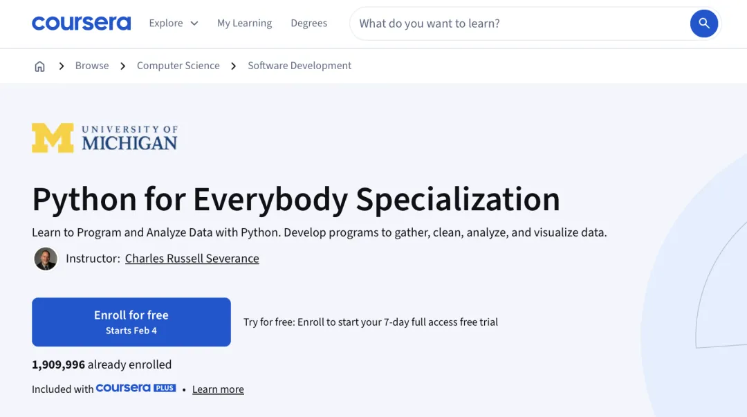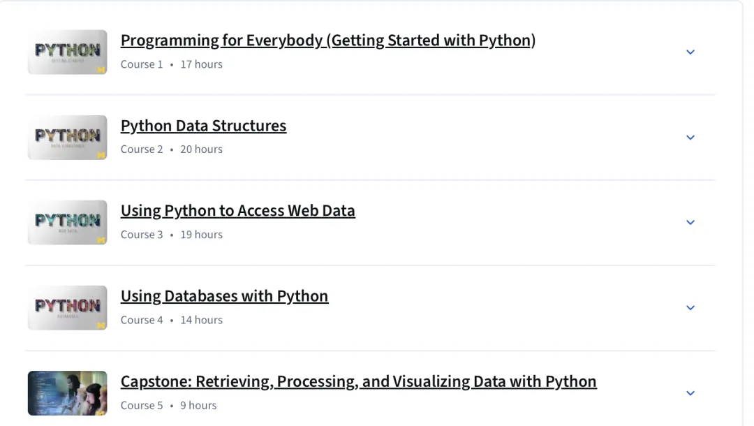 虽然CodeCombat对零基础人士很友好,但不能代替正式的课程。要系统学习的时候,我选择了Coursera上备受好评的《Python for Everybody》专项课程。