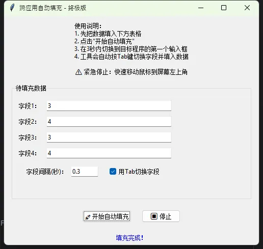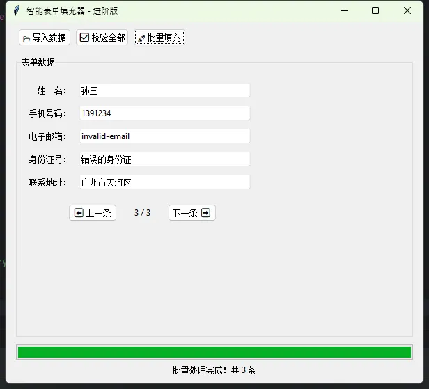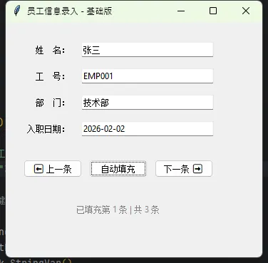 运行效果:打开窗口后点"自动填充",表单字段瞬间填好。再点"下一条",切换到下一组数据。