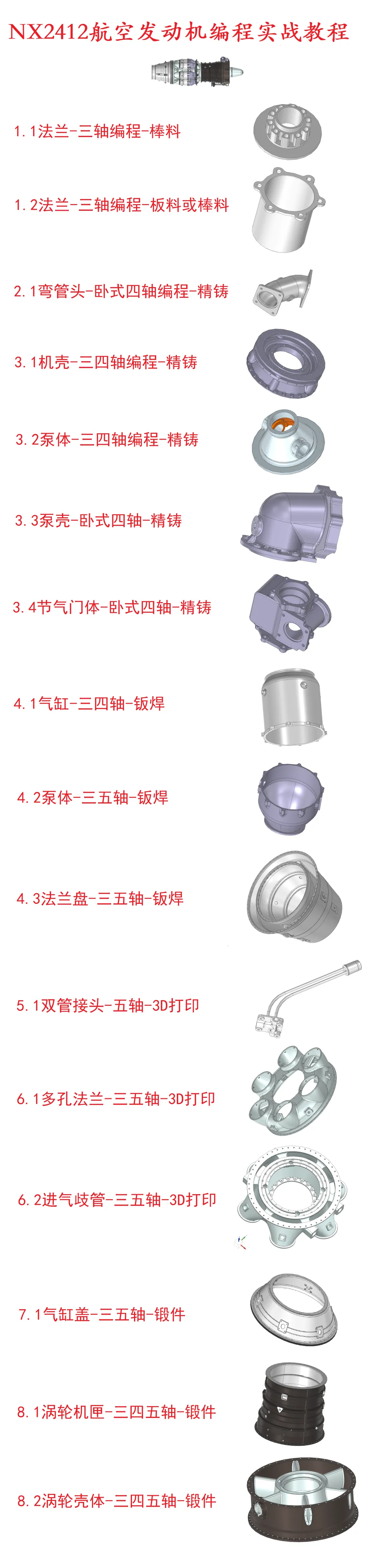 本节课以机壳为案例进行讲解,毛料为精铸,工艺方案为三轴+四轴编程,包含VT进行四轴仿真等内容,