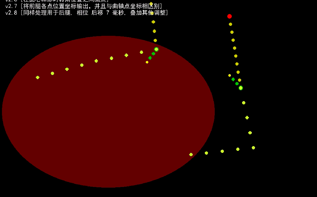 # curveline-3.pyimport numpy as npimport pygame"""_xOff = 120_yOff = 40scale = 50#"""#def gen_ecllips_frontleg_beautiful_dumb# 下划线输入比较麻烦,代码中有时有省略# 先计算曲轴,再计算连杆,成功。与先计算连杆运动,再计算曲轴相比,前者更简洁。# 重新开始,先计算一个椭圆圆周运动的曲轴,再尝试曲轴顶端任意旋转,# 并将 currenttime 作为参数继续传给下一个子程序## 放弃后腿,转移至前腿,并将发力点 移至前大腿根部## 定义 beautifulfrontleg,输出beautifulfrontleg,仅绘制beautifulfrontleg# 其他非 beautifulfronleg 坐标数据不再绘制 ###### 注:本段代码中, frontleg_dots 实际上是虚拟的“椭圆曲轴连杆”,legs 是所谓的抽象马/印象马前腿点阵坐标# ##def gen_ecllipsfrontlegdeautfuldumb(currenttime: float):pygame.display.set_caption("红包封面:跑马尝试[前腿 frontleg]")xOff = 450yOff = 300angleOff = 90_L = 250_S = 100 # 椭圆长轴_S_S = 40 # 椭圆短轴frongleg_dots = []current_position = currenttime % 36a = current_position * 10 + angleOffaR = a * np.pi / 180# 曲轴顶点坐标x1 = np.cos(aR) * _Sy1 = -np.sin(aR) * _S_Sfrongleg_dots.append((x1, y1))### pygame.draw.circle(screen, (0,200,0, 50),(int(x1+xOff),int(y1+yOff)), 7)# 曲轴副属各点坐标for i in range(2):x = np.cos(aR) * _S / 3 * (i+1)y = -np.sin(aR) * _S_S / 3 * (i+1)frongleg_dots.append((x, y))### pygame.draw.circle(screen, (0,200,0, 50),(int(x+xOff),int(y+yOff)), 5)# 连杆顶点坐标x = xOffy = np.sqrt(_L**2 - abs(x1)**2) - y1# print(y)frongleg_dots.append((x, y))### pygame.draw.circle(screen, (250, 0,0, 110),(int(x),int(yOff-y)), 7)# 连杆附属各点xSeg = x1 / 9ySeg = abs(y1 + y) / 9for i in range(9):_x = (i+1) * xSeg_y = (i+1) * ySegfrongleg_dots.append((_x, _y))### pygame.draw.circle(screen, (200, 200, 0, 50), (int(xOff + _x), int(yOff-y+_y)), 5)### pygame.draw.circle(screen, (250, 250, 0, 110),(int(xOff),int(yOff)), 4)legs = []legs.append((x1+xOff, y1+yOff))newX, newY, legs2 = draw_curve_stop_at_any_dot_output(currenttime, 185, 250, 185, x1+xOff, y1+yOff)for i in range(len(legs2)):legs.append(legs2[i])newX, newY, legs2 = draw_curve_stop_at_any_dot_output(currenttime, 180, 350, 185, newX, newY)for i in range(len(legs2)):legs.append(legs2[i])screen.blit(font.render("v2.3 [曲轴 任意方向连杆]", True, (255, 255, 255)), (20, 40))screen.blit(font.render("v2.4 [椭圆 曲轴 任意方向连杆]", True, (255, 255, 255)), (20, 60))screen.blit(font.render("v2.5 [转移至前腿 调整旋转方向至左下方]", True, (255, 255, 255)), (20, 80))screen.blit(font.render("v2.6 [在圆心和即时转角位置之间画点]", True, (255, 255, 255)), (20, 100))screen.blit(font.render("v2.7 [将前腿各点位置坐标输出,并且与曲轴点坐标相区别]", True, (255, 255, 255)), (20, 120))return frongleg_dots, legs#def draw_curve_stop_at_any_dot_output()# 在任意位置按指定半径画圆,# 并在给定的 startangle, stopangle 之间根据时间输出当前即时位置, 返回时角度以当前时间而定## 并在新绘制的 当前时间转角圆周点 与 圆心 之间 以适当间隔 绘制 “圆点”## 同时保留点坐标数据,输出点坐标数据 ##def draw_curve_stop_at_any_dot_output(currenttime: float, startangle, stopangle: float, radius:float, atX: int, atY: int):_xOff = atX_yOff = atY#pygame.draw.ellipse(screen, (205,5,255), ((atX-radius,atY-radius),(2*radius,2*radius)),1)a = startangle * np.pi / 180x = np.cos(a) * radius + _xOffy = -np.sin(a) * radius + _yOff#pygame.draw.circle(screen, (0,200,0, 50),(int(x),int(y)), 5)b = stopangle * np.pi / 180x = np.cos(b) * radius + _xOffy = -np.sin(b) * radius + _yOff#pygame.draw.circle(screen, (200,0,0, 50),(int(x),int(y)), 5)legdots = []current_position = currenttime % 36aSeg = (stopangle - startangle) / 18atAngle = stopangle - abs(18-current_position) * aSegaRad = atAngle * np.pi / 180x = np.cos(aRad) * radius + atXy = -np.sin(aRad) * radius + atY#legdots.append((x, y))#pygame.draw.circle(screen, (0,200,200, 50),(int(x),int(y)), 5)#pygame.draw.line(screen, (250,0,250),(int(x),int(y)),(int(atX),int(atY)),2)xSeg = (x - atX) / 4ySeg = (y - atY) / 4for i in range(4):_x = (i+1) * xSeg_y = (i+1) * ySeglegdots.append((atX + _x, atY + _y))#pygame.draw.circle(screen, (200, 200, 0, 50), (int(atX + _x ), int(atY + _y)), 10)return x, y, legdotsdef show_legdots(currenttime: float, legdots):screen.fill((20,20,20,30))for x, y in legdots:pygame.draw.circle(screen, (200,250,50,100),(int(x),int(y)), 5)def show_legdots_flash(currenttime: float, legdots):#screen.fill((0,0,0))currentFlashPos = int(currenttime % 2)idx = -1for _x, _y in legdots:idx += 1if idx % 2 == currentFlashPos % 2:_r_, _g_, _b_ = 254, 50, 0#_r_,_g_, _b_ = 250, 100, 50else:_r_, _g_, _b_ = 200, 200, 40#_r_,_g_, _b_ = 200, 250, 20pygame.draw.circle(screen, (_r_, _g_, _b_, 100), (_x, _y), 10)#for x, y in legdots:# pygame.draw.circle(screen, (200,250,50,100),(int(x),int(y)), 5)#def show_legdots_flash_large 在最后绘制闪缩效果时,再叠加一次临时放大,重新指定 放大基点和放大系数def show_legdots_flash_large(currenttime: float, legdots, pt, scale):#screen.fill((0,0,0))cX, cY = ptcurrentFlashPos = int(currenttime % 2)idx = -1for _x, _y in legdots:xLen = _x - cXyLen = _y - cY__x = xLen * scale + cX__y = yLen * scale + cYidx += 1if idx % 2 == currentFlashPos % 2:_r_, _g_, _b_ = 254, 50, 0#_r_,_g_, _b_ = 250, 100, 50else:_r_, _g_, _b_ = 200, 200, 40#_r_,_g_, _b_ = 200, 250, 20pygame.draw.circle(screen, (_r_, _g_, _b_, 100), (int(__x), int(__y)), int(20*scale))#for x, y in legdots:# pygame.draw.circle(screen, (200,250,50,100),(int(x),int(y)), 5)pygame.init()screen = pygame.display.set_mode((1000, 720), pygame.RESIZABLE | pygame.HWSURFACE | pygame.SRCALPHA )pygame.display.set_caption("红包封面:")clock = pygame.time.Clock()font = pygame.font.SysFont("simhei", 18)speedDelta = 50scaleDelta = 6start_time = pygame.time.get_ticks() / speedDeltarunning = True
