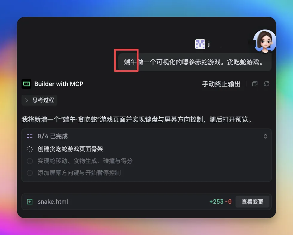 AI直接就干活了,甚至把被吃的对象做成了一个三角形的粽子,孩子也没觉得这有啥不妥,反正都是贪吃蛇,能玩就行,将错就错吧!