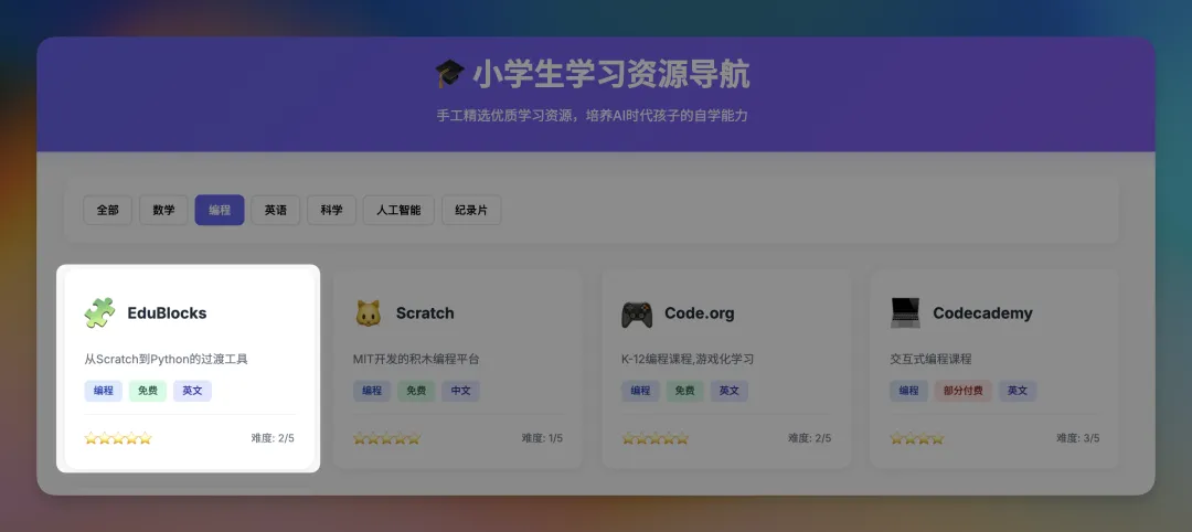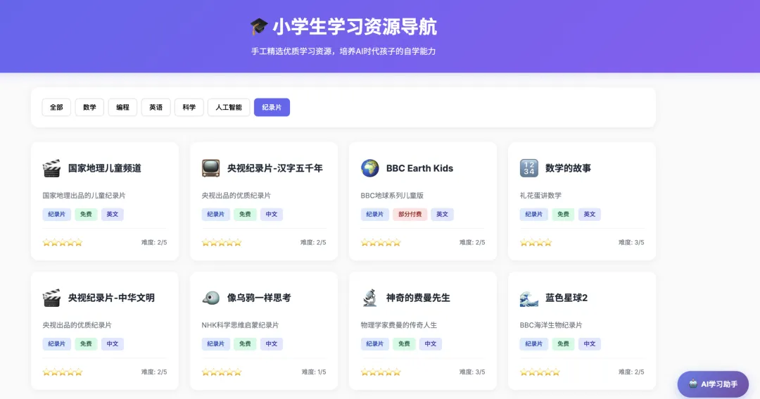 于是我打开了给孩子做的学习网站,这个网站是我给孩子Vibe coding出来的学习资源导航站,精选了适合孩子的数学、编程、科学、纪录片、AI等资源。