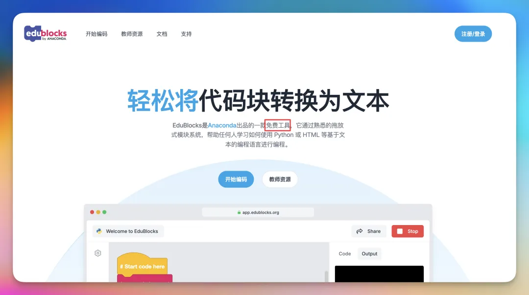 在这个导航站里,点击「编程」,就能看到第一个编程学习网站EduBlocks,适合从scratch过渡到文本编程的孩子。
