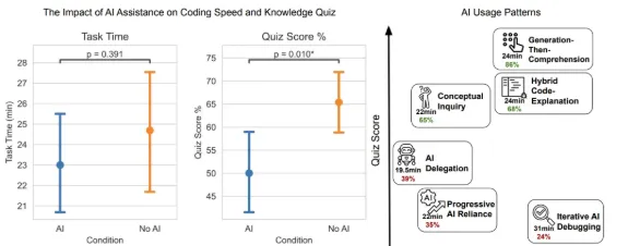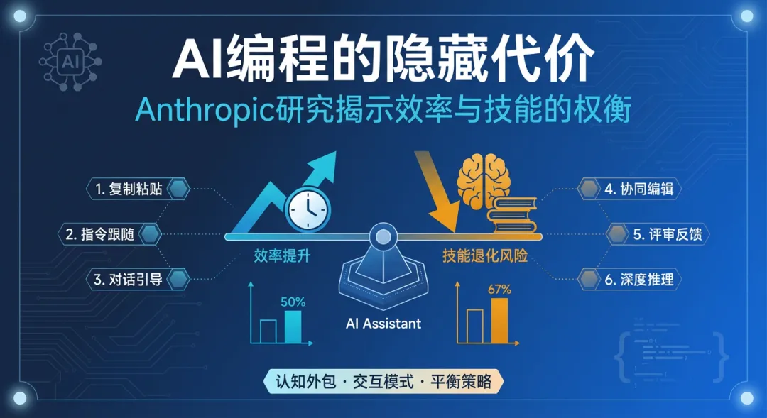 Anthropic的这项研究提供了重要警示:AI编程助手在提升即时生产力的同时,可能对技能形成产生负面影响。关键不在于是否使用AI,而在于如何使用。