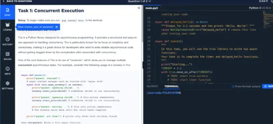 实验流程: 1. 热身阶段 2. 使用Trio库完成两个功能开发任务 3. 立即进行知识测验