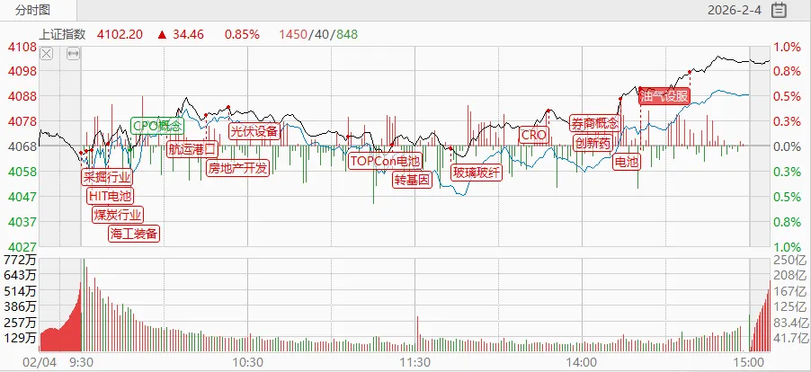 A股三大指数2月4日涨跌不一,沪指涨0.85%,收报4102.20点;深证成指涨0.21%,收报14156.27点;创业板指探底回升,盘中跌幅一度达到2.4%,最终小幅收跌0.4%,收报3311.51点。沪深京三市成交额达到2.5万亿,较昨日小幅缩量623亿。