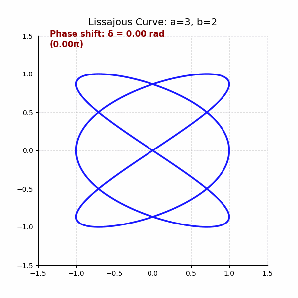 import numpy as npimport matplotlib.pyplot as pltfrom matplotlib.animation import FuncAnimation, PillowWriter# ===== 配置参数 =====a, b = 3, 2 # 频率比 (a:b 决定图案复杂度)frames = 100 # 动画帧数duration = 4 # 动画总时长(秒)fps = 25 # 帧率# ===== 生成基础数据 =====t = np.linspace(0, 2 * np.pi, 1000) # 时间参数fig, ax = plt.subplots(figsize=(6, 6))ax.set_xlim(-1.5, 1.5)ax.set_ylim(-1.5, 1.5)ax.set_aspect('equal')ax.grid(True, linestyle='--', alpha=0.4)ax.set_title(f'Lissajous Curve: a={a}, b={b}', fontsize=14, pad=15)# 初始化曲线和相位文本line, = ax.plot([], [], 'b-', lw=2.5, alpha=0.9)phase_text = ax.text(0.05, 0.95, '', transform=ax.transAxes, fontsize=12, color='darkred', weight='bold')# ===== 动画更新函数 =====def animate(frame): # 相位差从0 → 2π 循环变化 delta = 2 * np.pi * frame / frames # 计算李萨如坐标 x = np.sin(a * t + delta) y = np.sin(b * t) # 更新曲线和文本 line.set_data(x, y) phase_text.set_text(f'Phase shift: δ = {delta:.2f} rad\n({delta / np.pi:.2f}π)') return line, phase_text# ===== 创建动画 =====ani = FuncAnimation( fig, animate, frames=frames, interval=1000 / fps, # 每帧间隔(毫秒) blit=True, repeat=True)# ===== 保存为GIF =====print("正在生成GIF动画 ..")writer = PillowWriter(fps=fps)# 显示动画(可选)plt.tight_layout()plt.show()