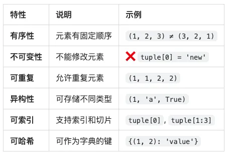 元组是Python中的有序不可变数据结构,一旦创建就不能修改。# 基本示例fruits = ('apple', 'banana', 'orange')numbers = (1, 2, 3, 4, 5)mixed = (1, 'hello', 3.14, True, [1, 2, 3])