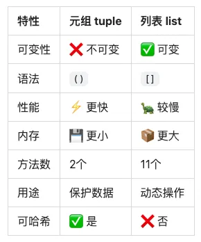 # ✅ 使用列表的场景# 1. 需要频繁修改数据shopping_cart = ['apple', 'banana']shopping_cart.append('orange') # 添加商品shopping_cart.remove('banana') # 删除商品# 2. 需要排序scores = [85, 92, 78, 90]scores.sort()# 3. 需要动态增删todo_list = []todo_list.append('task1')todo_list.append('task2')# ✅ 使用元组的场景# 1. 数据不应该被修改(保护数据)WEEKDAYS = ('Mon', 'Tue', 'Wed', 'Thu', 'Fri', 'Sat', 'Sun')RGB_RED = (255, 0, 0)ORIGIN = (0, 0)# 2. 作为字典的键location_names = { (0, 0): 'Origin', (1, 0): 'East', (0, 1): 'North'}# 3. 函数返回多个值def get_min_max(numbers): return min(numbers), max(numbers)min_val, max_val = get_min_max([1, 2, 3, 4, 5])# 4. 数据库查询结果(通常是元组)# cursor.fetchone() 返回元组# result = (1, 'Alice', 25)# 5. 性能敏感的场景# 大量小数据结构,使用元组节省内存points = [(x, y) for x in range(100) for y in range(100)]