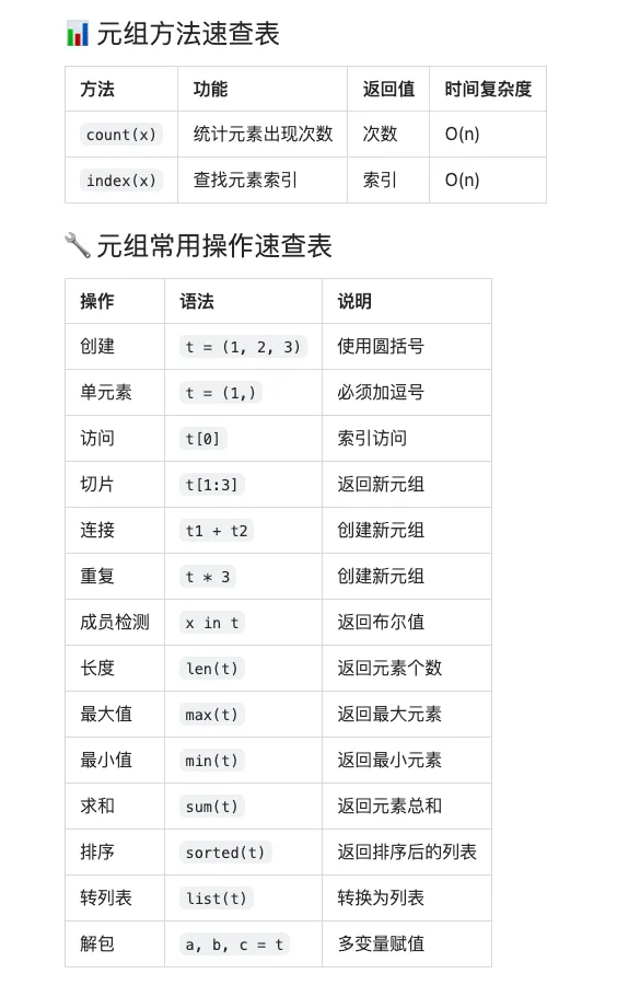 numbers = (3, 1, 4, 1, 5, 9, 2, 6)# len() - 长度print(len(numbers)) # 8# max() - 最大值print(max(numbers)) # 9# min() - 最小值print(min(numbers)) # 1# sum() - 求和print(sum(numbers)) # 31# sorted() - 排序(返回列表)sorted_list = sorted(numbers)print(sorted_list) # 输出: [1, 1, 2, 3, 4, 5, 6, 9]print(type(sorted_list)) # 输出: <class 'list'># 降序排序sorted_desc = sorted(numbers, reverse=True)print(sorted_desc) # 输出: [9, 6, 5, 4, 3, 2, 1, 1]# 转回元组sorted_tuple = tuple(sorted(numbers))print(sorted_tuple) # 输出: (1, 1, 2, 3, 4, 5, 6, 9)# all() - 所有元素为Trueprint(all((True, True, True))) # Trueprint(all((True, False, True))) # Falseprint(all((1, 2, 3))) # Trueprint(all((1, 0, 3))) # False# any() - 任一元素为Trueprint(any((False, False, True))) # Trueprint(any((False, False, False))) # Falseprint(any((0, 0, 1))) # True# enumerate() - 枚举fruits = ('apple', 'banana', 'orange')for idx, fruit in enumerate(fruits): print(f"{idx}: {fruit}")# 输出:# 0: apple# 1: banana# 2: orange# zip() - 并行迭代names = ('Alice', 'Bob', 'Charlie')ages = (25, 30, 35)for name, age in zip(names, ages): print(f"{name}: {age}")# 输出:# Alice: 25# Bob: 30# Charlie: 35# 转换为元组列表pairs = tuple(zip(names, ages))print(pairs) # 输出: (('Alice', 25), ('Bob', 30), ('Charlie', 35))
