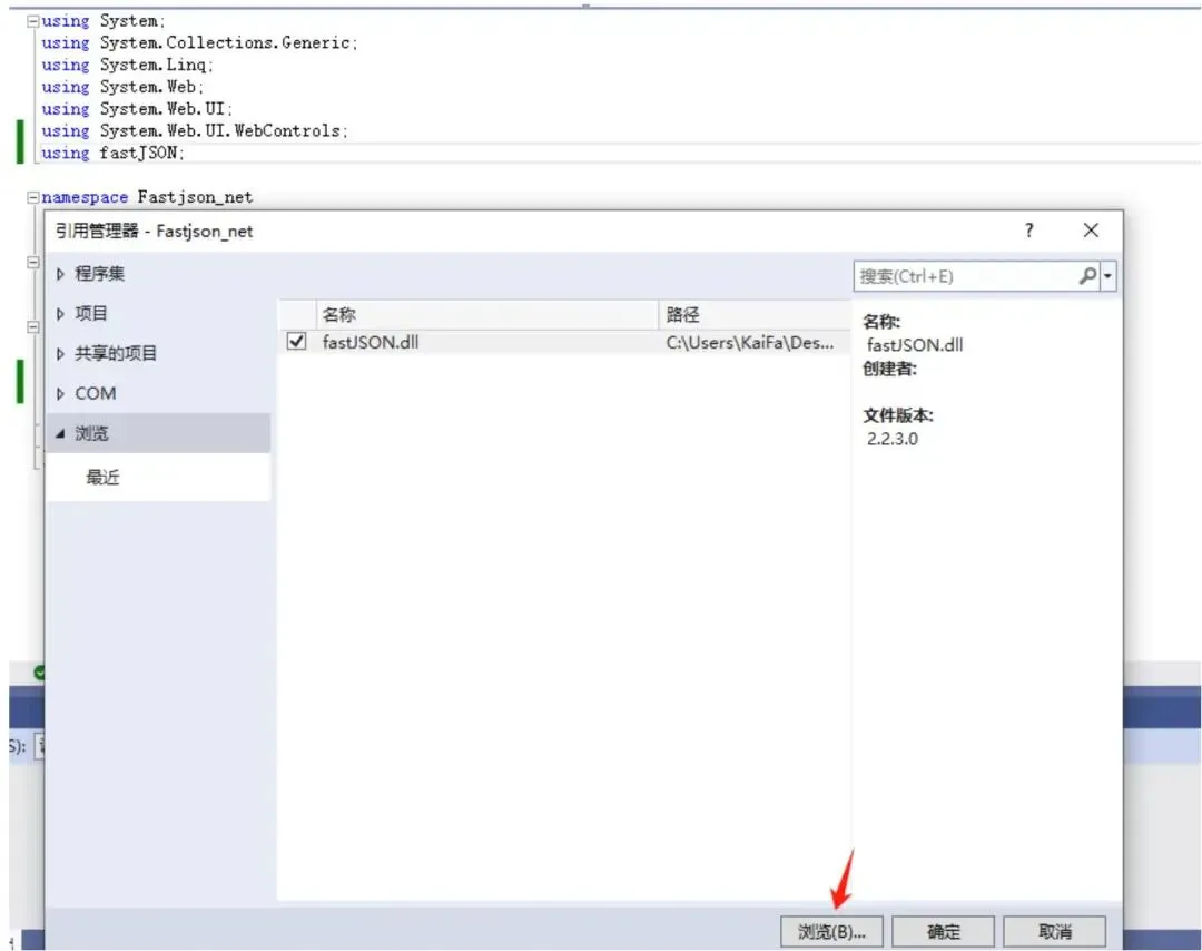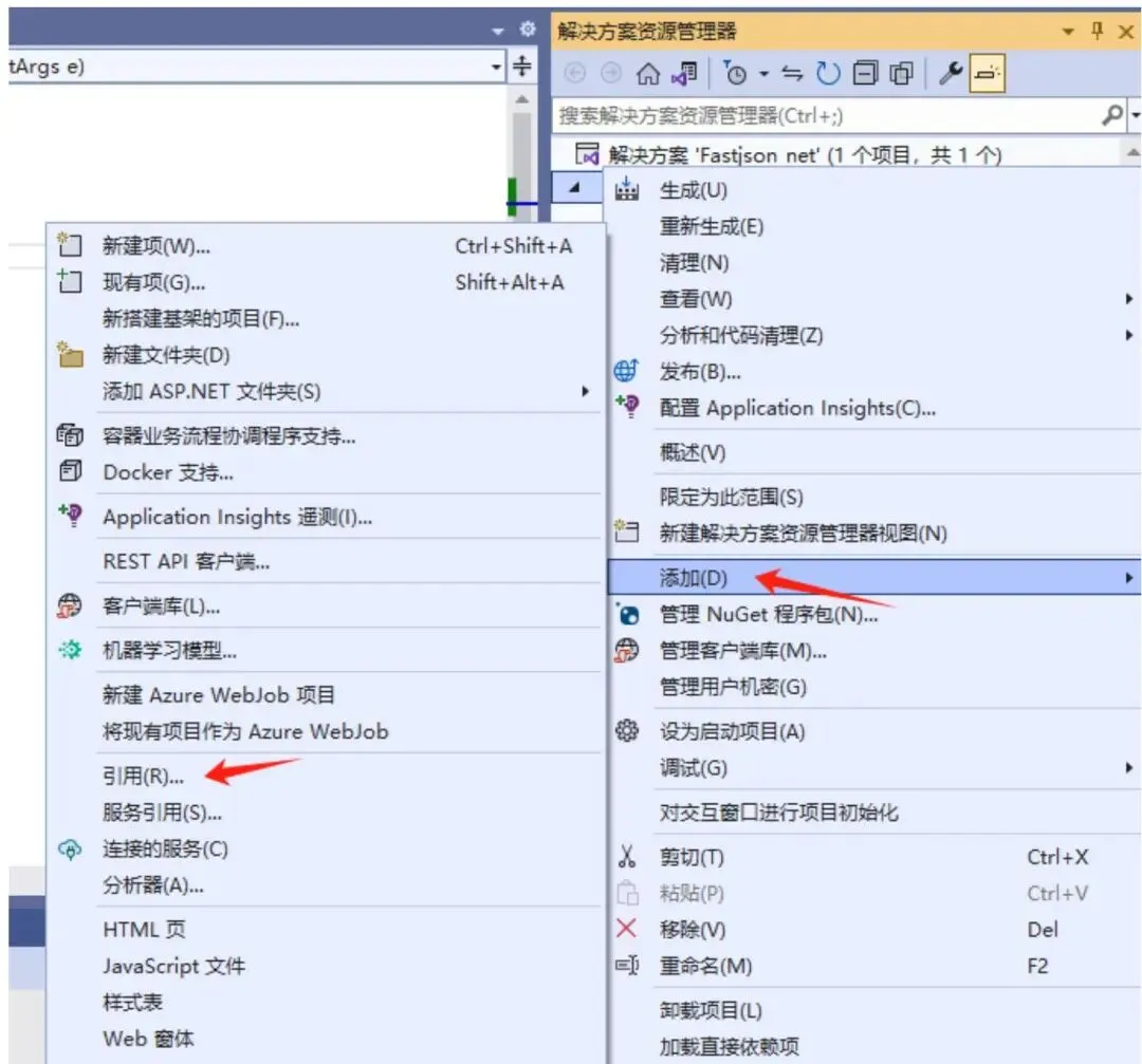 将 DLL 添加到项目: 打开你的项目,将 DLL 文件添加到项目中。在 Visual Studio 中,右键单击项目,选择“添加 $^ { \prime \prime } >$ “现有项目”,然后选择 FastJSON 的 DLL 文件。